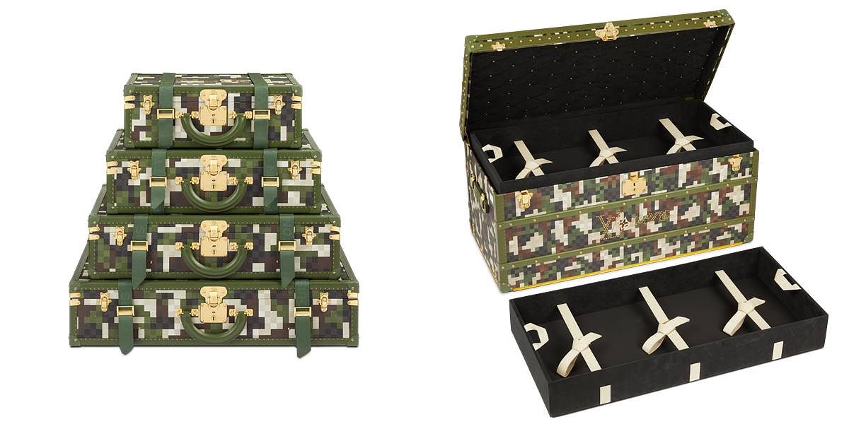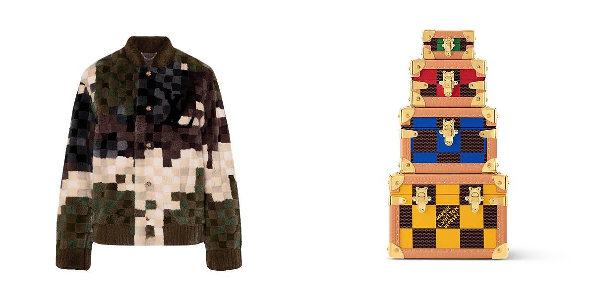 此次多樣獨家商品包括以Damoflage像素化迷彩棋盤格為主題的貂皮外套、鑲綴LVERS的Courrier Lozine 110硬箱、Pyramide Bisten Damoflage四件硬箱塔、Coffret 8 Montres腕錶收納硬箱;兩款「神秘隱藏版」Malle Courrier 110 Cuivre與Ecrin Cuivre銅製系列硬箱,以及黃色、藍色、紅色及綠色的Malle Pyramide Damier Pop Multicolor四件硬箱塔。