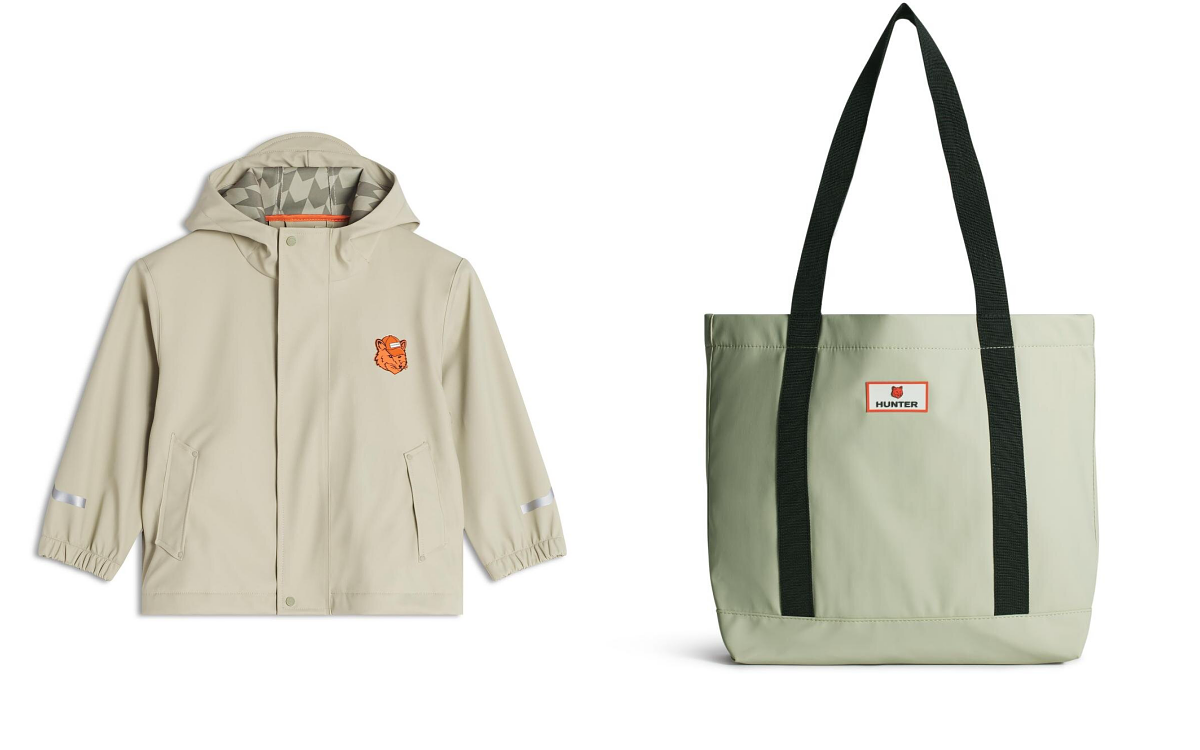 膠囊系列中的雨具服飾則包括一件米色雨衣與一件月桂綠斗篷,細節採用品牌壓紋暗扣與專屬斜紋印花內裡。岩沙米色短T上那隻戴著 Hunter 標誌棒球帽的小狐狸圖像,象徵著兩大品牌難得的創意與文化交流。兒童系列以全版狐狸印花呈現,包含一款連帽雨衣與白色與藍色 T 恤。本次 Maison Kitsuné x Hunter 聯名膠囊系列亦推出大型月桂綠托特包與一把內襯斜紋印花的亮橘色雨傘,完整呈現一系列雨天實用並兼具時髦的聯名單品。