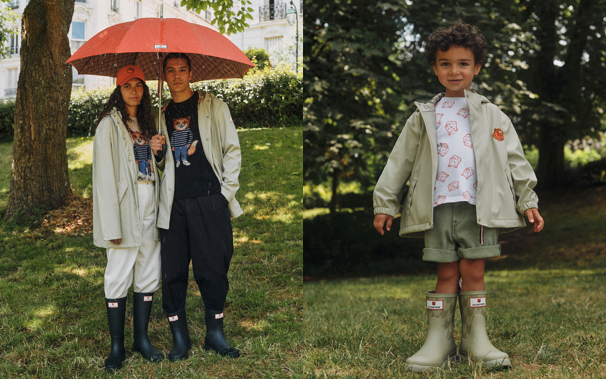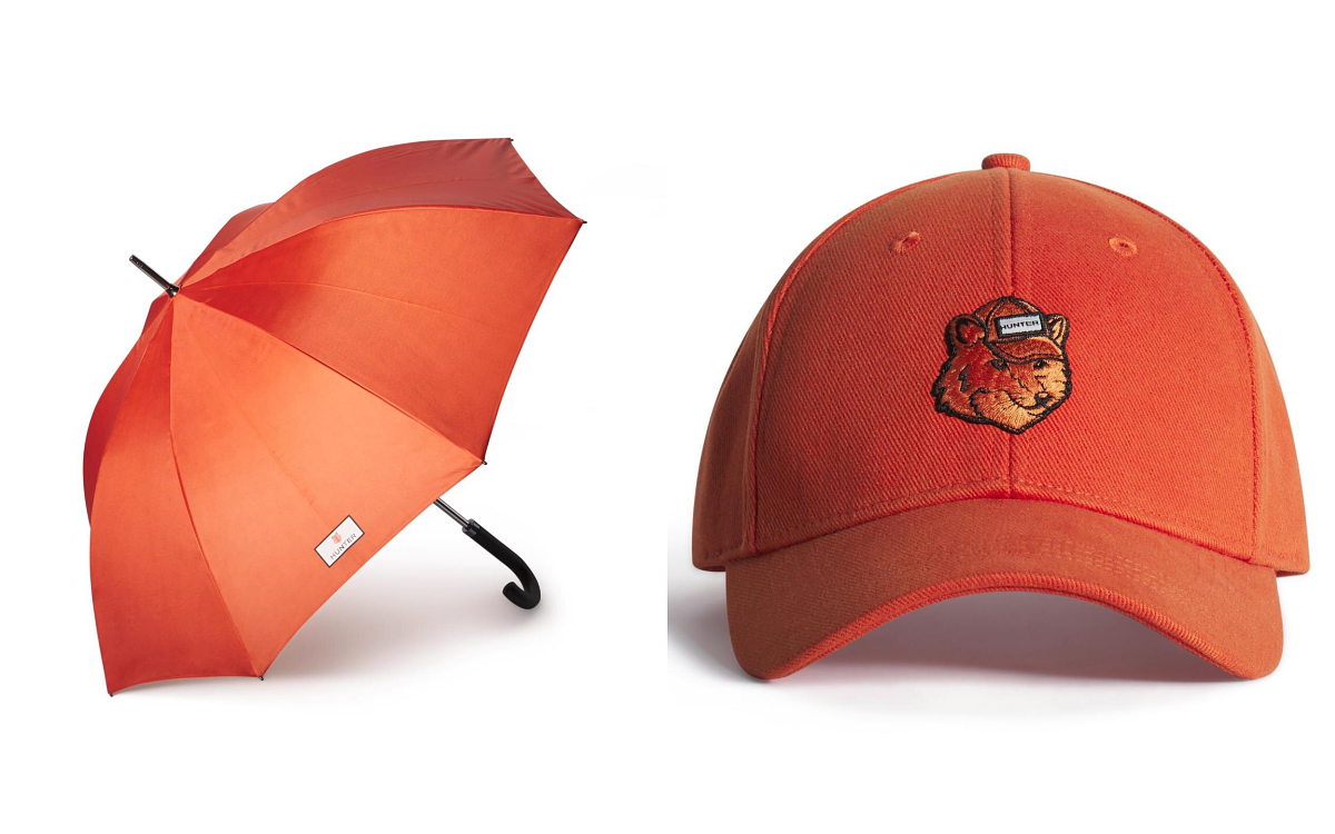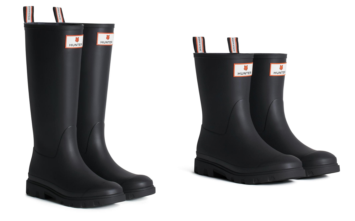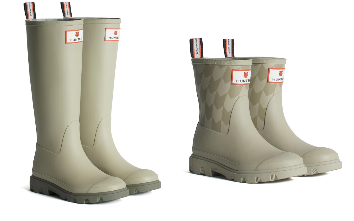 聯名系列的核心識別是重新設計的雙品牌標誌,以 Kitsuné 狐狸為主角,戴上印有 Hunter 標誌的棒球帽,展現靈動而俏皮的神情。本次膠囊系列,包含 Hunter 經典的 Downpour 靴款,高筒與短筒兩種款式,男女適用,並提供黑色與米色兩種選擇,內襯採用斜紋印花設計。亦有別具心裁的斜紋印花短靴款式可選。兒童系列則推出全版狐狸頭圖案靴款,包括海軍藍配白色圖案與米色配月桂綠圖案兩種版本。