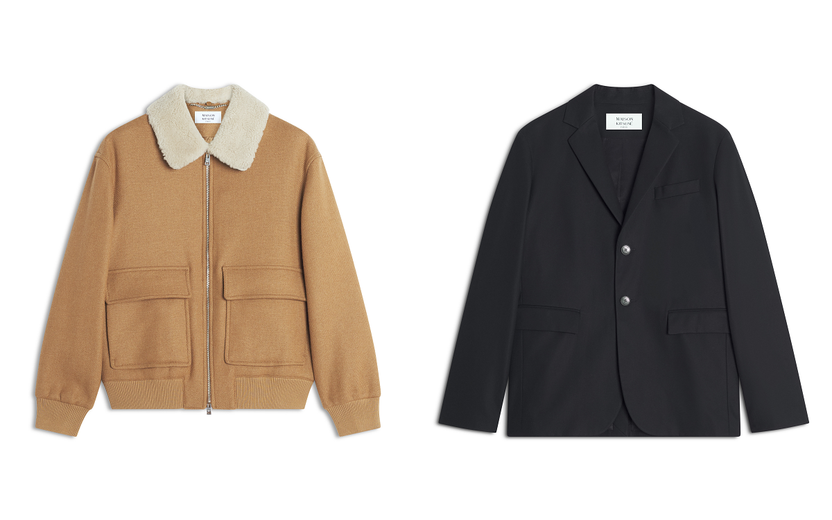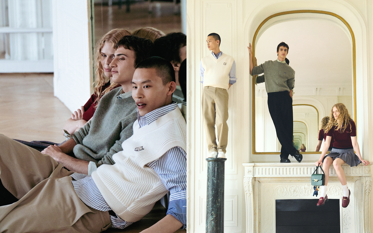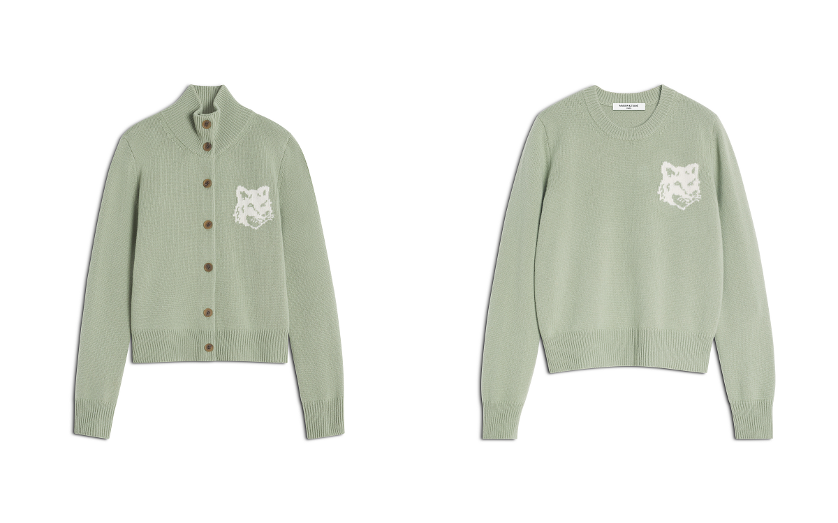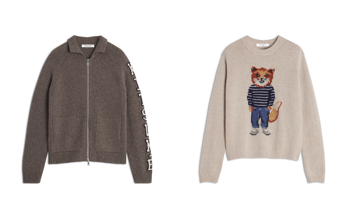 整體系列以中性基調展開灰、黑、駝與粉白貫穿全季,營造時髦且高雅的學院氣息。女裝部分以羽絨外套、短版夾克與百褶裙塑造立體廓形;男裝則以西裝外套、羊羔毛夾克為主,細節中融入 MAISON KITSUNÉ 法式優雅的放鬆線條。本季針織系列尤為值得關注,女裝有貝殼粉與鼠尾草綠等亮眼色彩單品為本季點綴柔和氛圍;男裝則推出以字母編織與毛海材質為主的學院風毛衣,兼具溫度與層次。