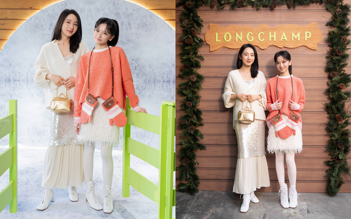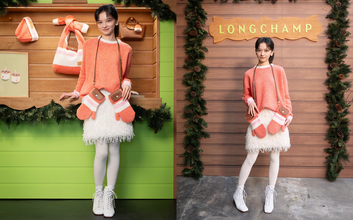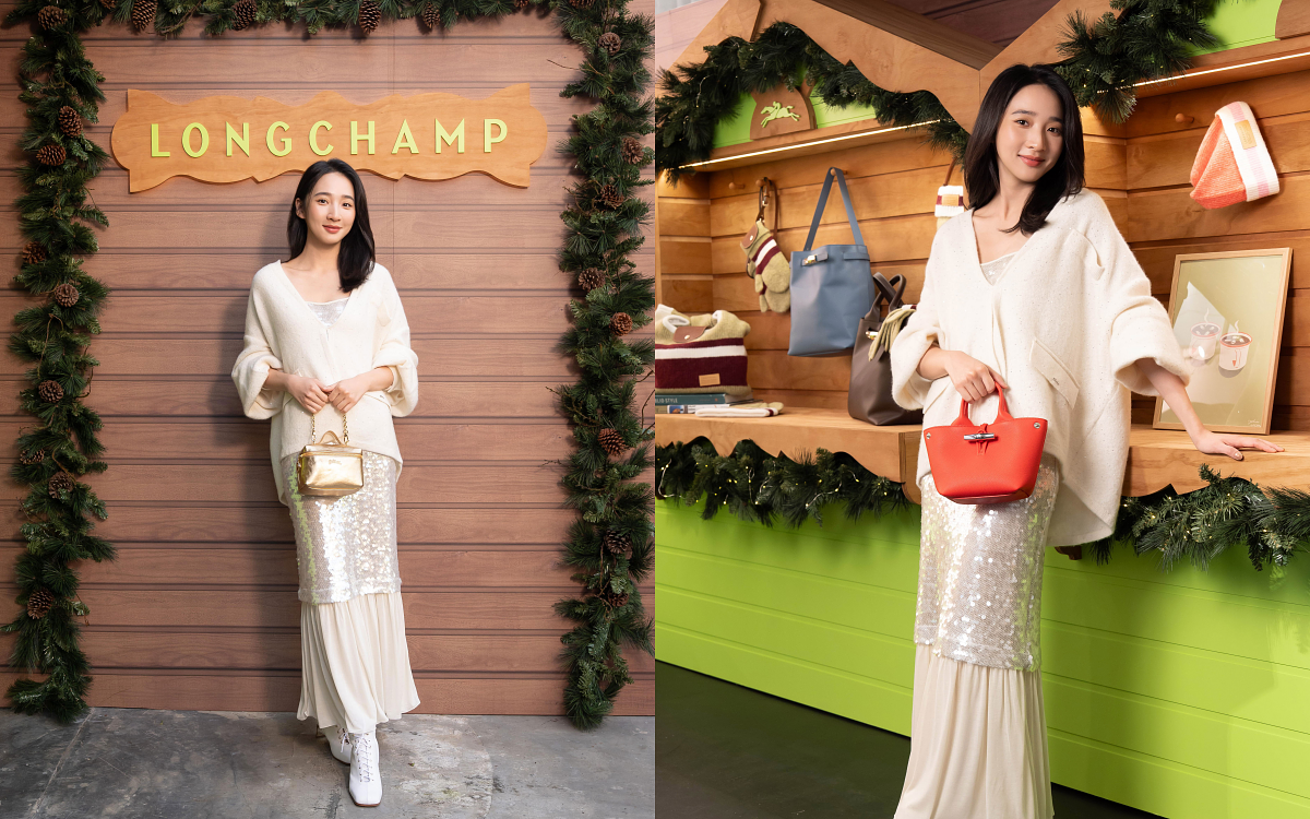 李沐以金屬光澤連身裙搭配柔和色系針織和服外套亮相,手拎 Le Pliage Xtra 系列金屬色包款,展現溫柔卻率性的迷人風格。腳上的溜冰鞋造型高跟短靴巧妙呼應主題場景,隨著燈光閃爍,連身裙上的亮片如雪中光影般閃耀,彷彿化身在冰面上滑行的巴黎女子。她也分享,Le Roseau 系列幸運餅乾造型的手提包亦為自己特別喜愛的單品,鮮豔的紅色在整體穿搭中成為搶眼亮點,為冬日注入一抹熱度與活力。