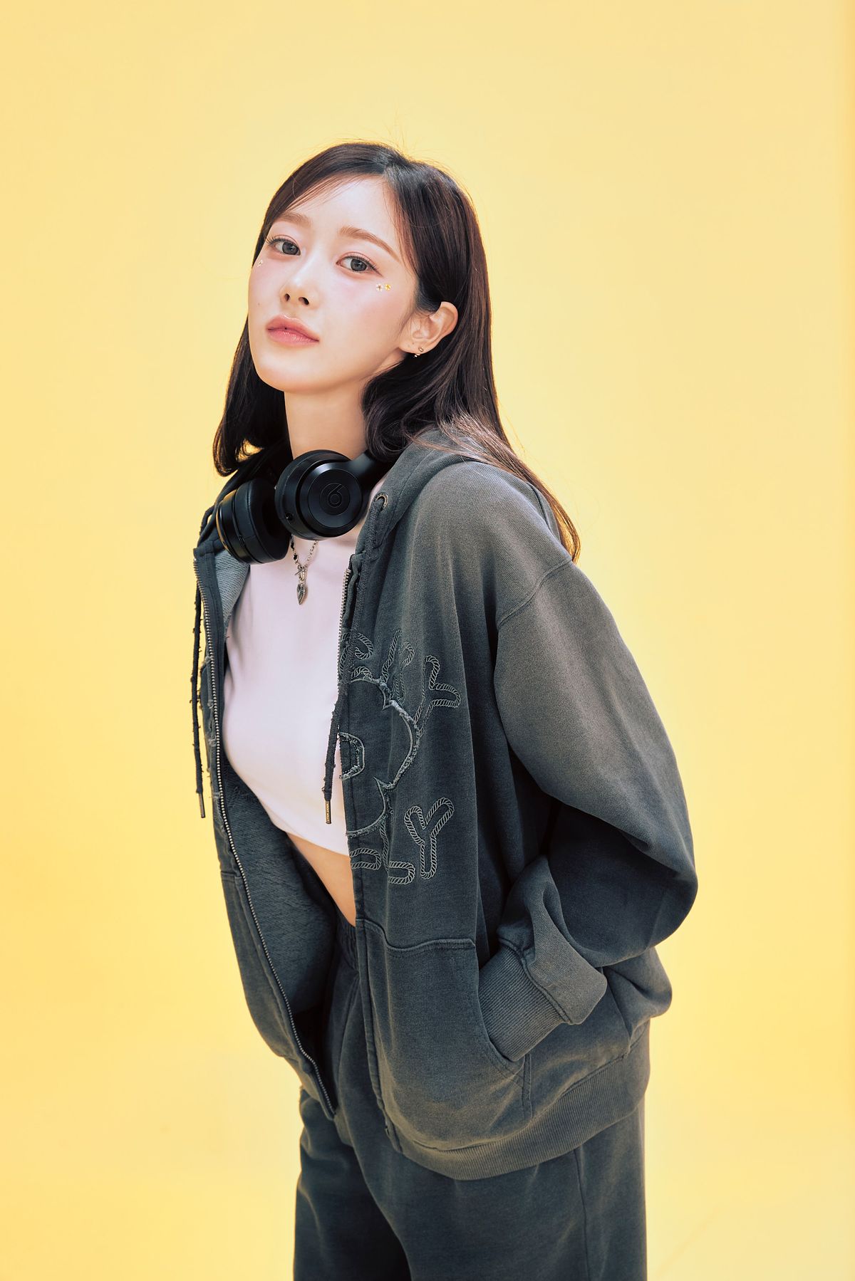本次春季系列將高飽和色彩與街頭層次完美揉合,GISELLE 在形象照中透過活潑的亮色系點亮春日氛圍,親自詮釋了兩套截然不同的風格: