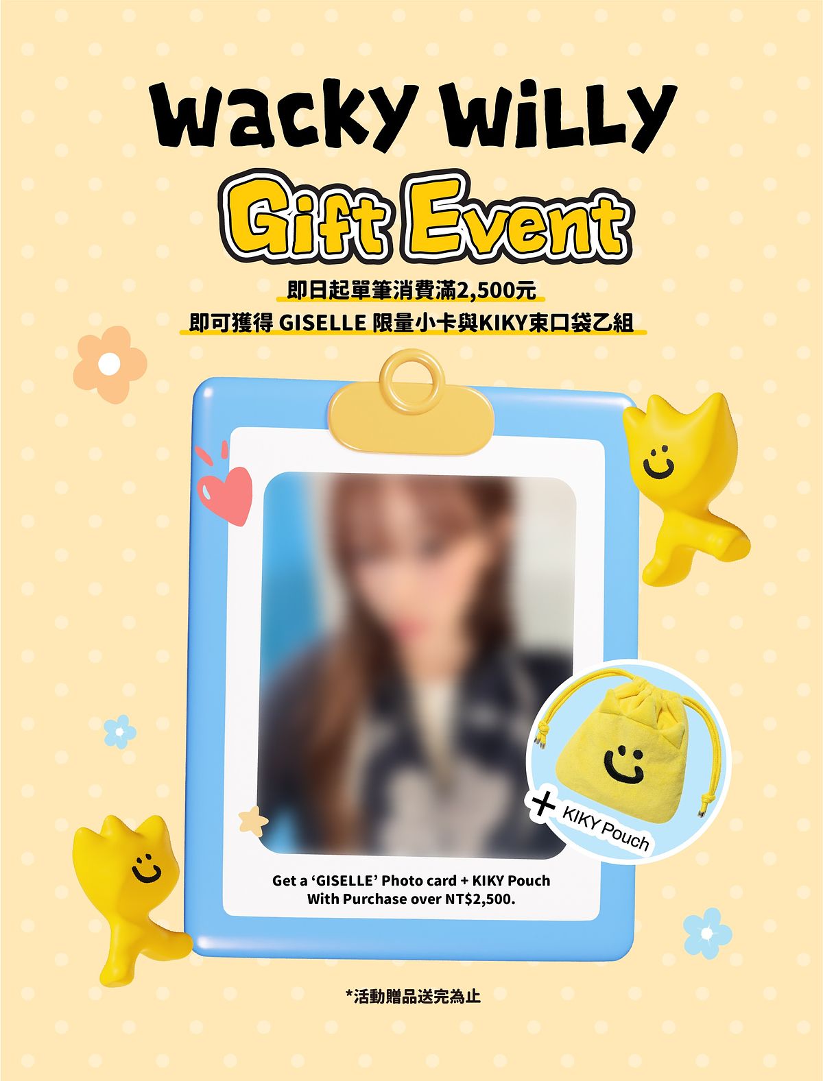 3/5 起,單筆消費滿 $2,500 即可獲得 GISELLE 小卡乙張 + KIKY 束口袋乙組,送完為止。