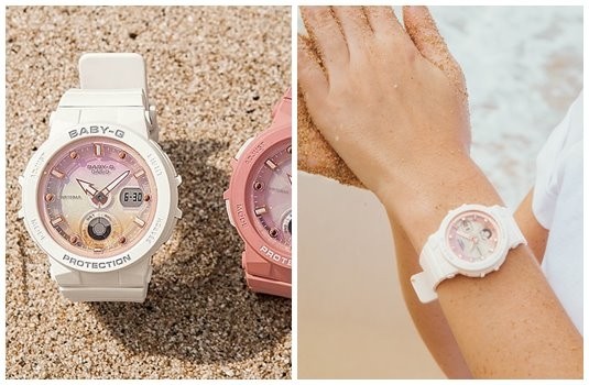 全新的BGA-250系列設計概念來自對海洋的熱愛,整個錶盤充滿海洋風格的設計巧思,如錶盤上金屬時刻猶如海面上的波光粼粼,且其條狀與圓點設計來自船舵概念,而時針則以船錨為靈感設計,另外錶款更有霓虹照明的功能,既造型滿分又實用到不行。其中BGA-250-7A2型號,以潔白乾淨的純白色搭配粉嫩果凍的淺粉色,在開賣後獲得最多喜愛且瘋狂熱銷,每個女孩戴上都毫無違和感,帶點清新可愛的氛圍也不過度。
