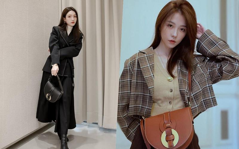 左:時尚部落客徐琁(Cos)手提Darryl馬鞍包,演繹包款優雅面貌(照片取自徐琁IG)/右:邵雨薇以咖啡色Darryl馬鞍包搭配同色系闊肩外套與寬管褲 (照片取自邵雨薇IG)