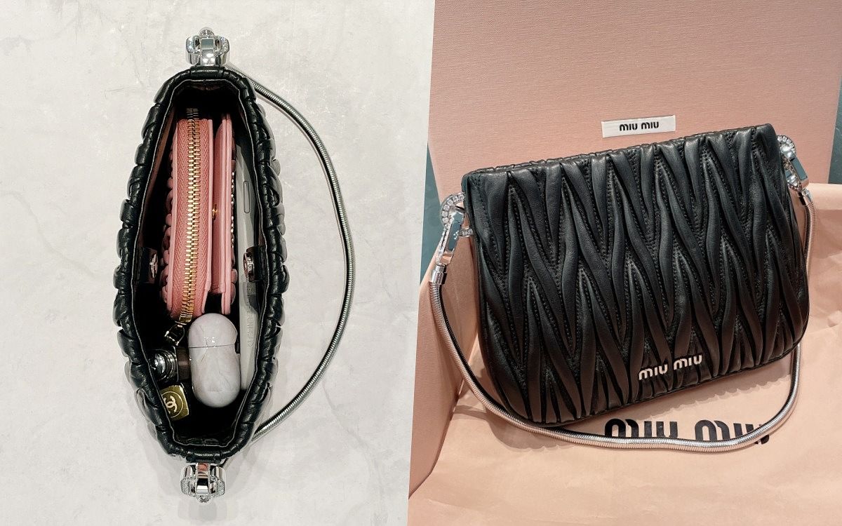 Miu Miu新款SASSY手袋,以Matelassé工藝替納帕軟皮手袋注入活力,細節中都點綴著金屬飾件、水晶等,精緻優雅的外觀休閒或正式場合都適合,袋身可收納短夾、收機等,匆忙行程中也能自在移動!