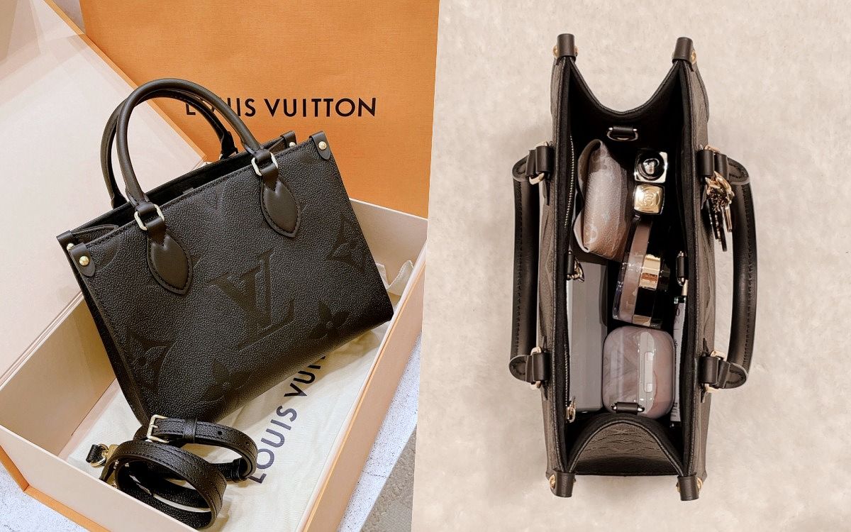 LV最新必收款就是托特包!這款OnTheGo靈感源來自LV於1968年推出的著名Sac Plat,採用Monogram Empreinte皮革製造,正面以低調的Oversized Monogram壓花圖案呈現,耐看具有小巧思,實測款為迷你版,可容納iPad Mini、手機、皮夾、彩妝品等,方正寬敞內部彷彿永遠裝不滿!