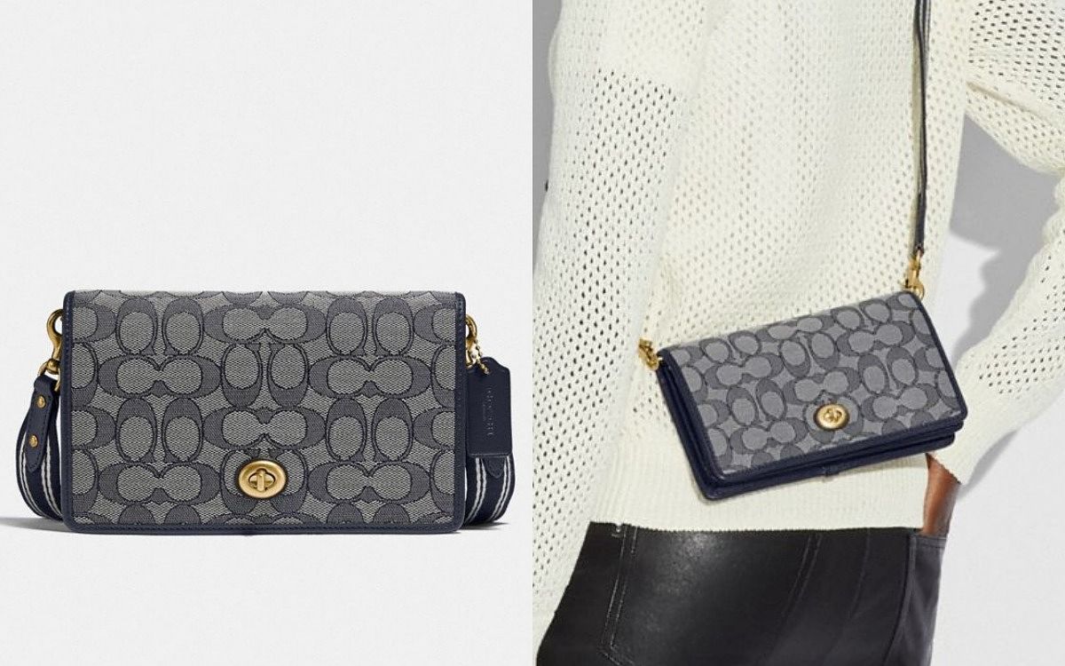 COACH Signature老花緹花面料,打造而成的斜背小包,輕巧、便利又實用,手袋點綴著典轉扣閉合設計,並附有可自由拆卸的肩帶,提供三種使用方式,買這一咖絕對划算!