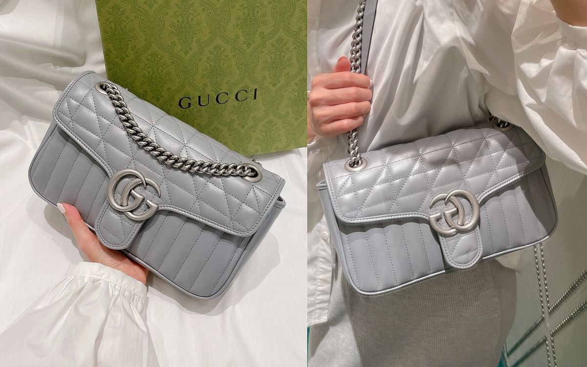 這次推出的全新GG Marmont系列,共有奶茶、黑色、銀灰、奶油色,其中討論度最高的就是這款全新銀灰色了!介於銀色與灰色間的霧灰感色調,耐看又耐髒的顏色,隨著光影散發出微微的光澤感,成為精品包中的夢幻色號!