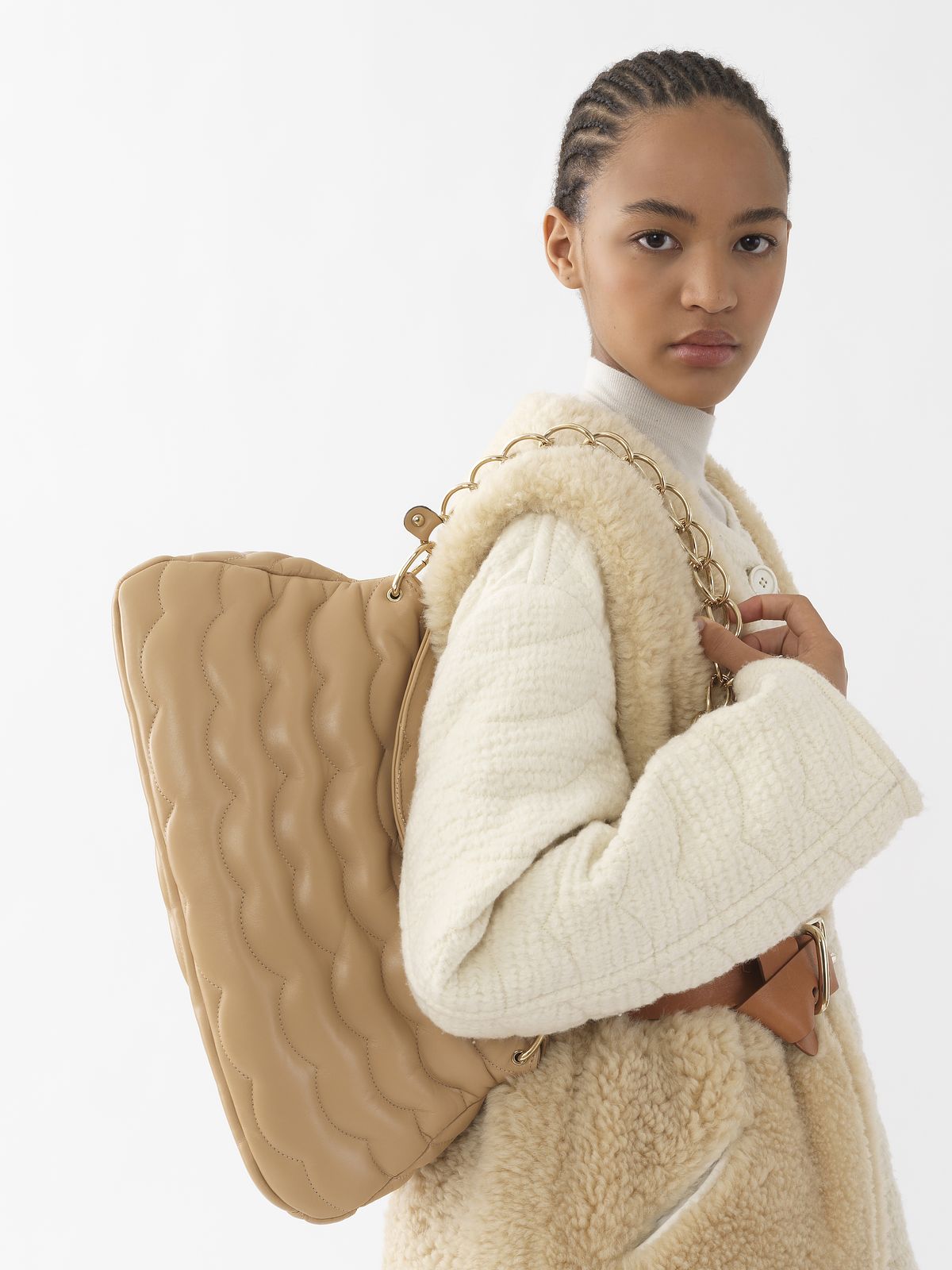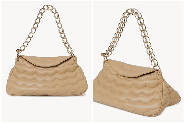 Juana鍊帶包共備有兩種尺寸:迷你款選用素面小牛皮,突顯恰似奶油光澤的皮革質地,可拆卸同色皮革背帶,賦予包款手提、側背與斜背等多種持用方式;中型尺寸以經典貝殼波浪紋絎縫妝點包身,可肩背亦適合作為手拿包。