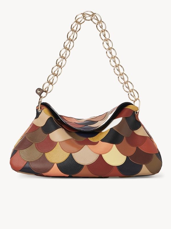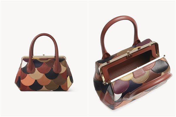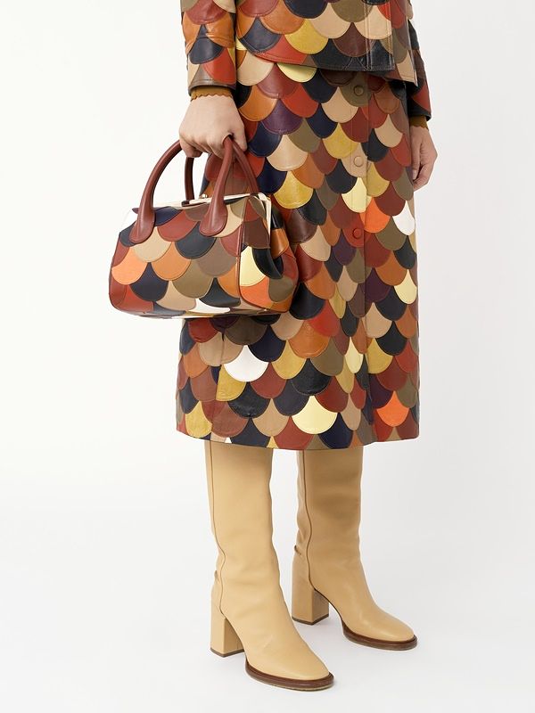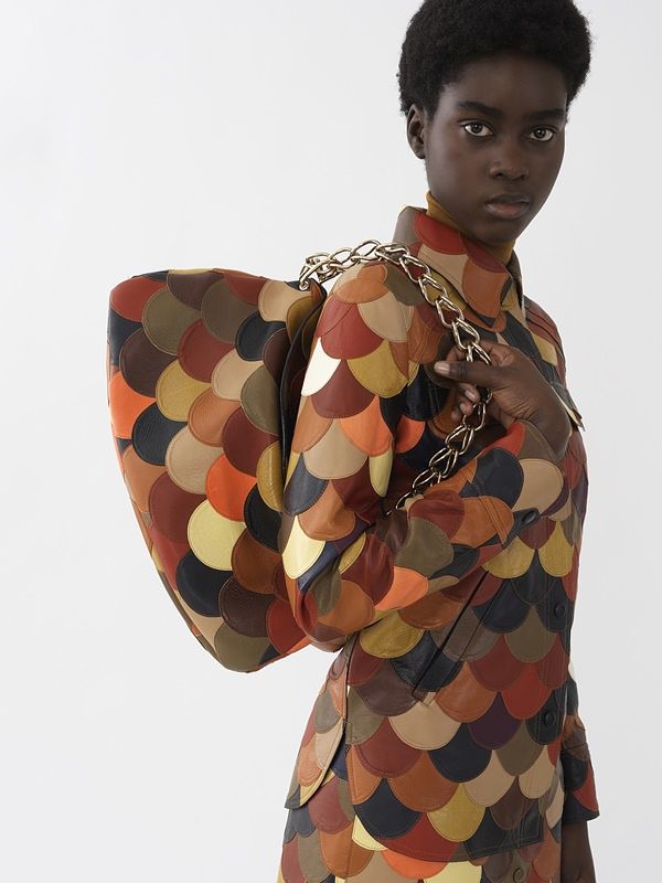 品牌創辦人Gaby Aghion最早於巴黎左岸的Café de Flore花神咖啡廳發表創作,自此咖啡廳地板上的貝殼波浪花紋便成為品牌經典設計元素,貫穿包款、鞋履及配件系列。本次Gabriela Hearst取材自日本代表幸運的鯉魚圖案,將貝殼波浪花紋創新演繹為多色拼接皮革,讓這只包款別具意義,同時也彰顯品牌特色及製作工藝。