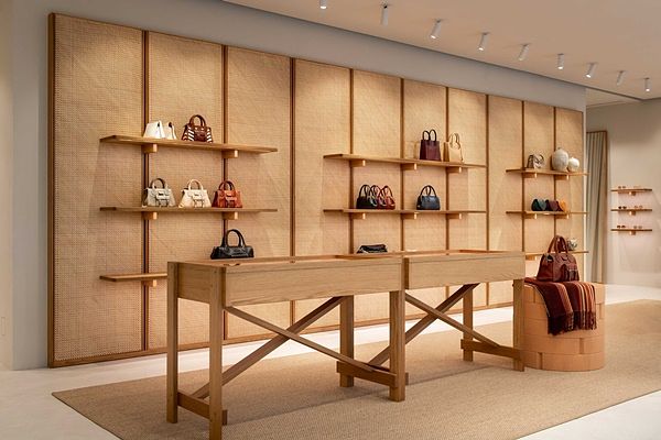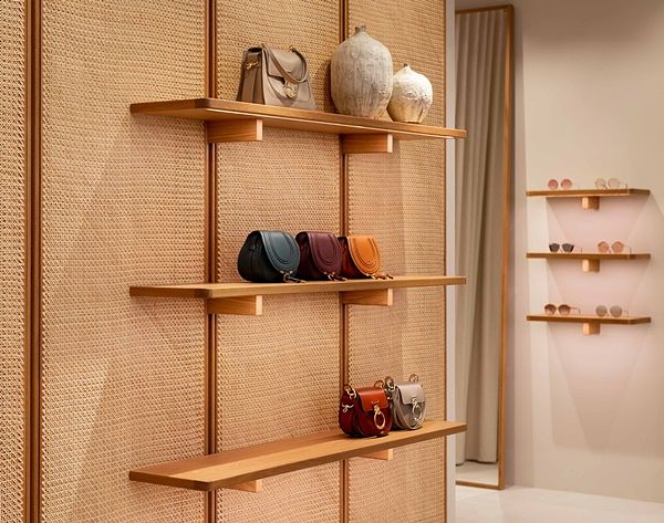 Chloé的永續願景亦體現在全新期間限定店裝:品牌的獨特性格透過天然材質巧妙呈現,包括竹藤、木材、天然纖維與陶土;精心選用的溫暖沙漠色調,象徵品牌創辦人Gaby Aghion的出生地─埃及,也呼應了現任創意總監Gabriela Hearst在南美烏拉圭長大的生活背景,這些根源貫穿了全新店裝的設計概念,展現傳統與摩登兼具的氣質。