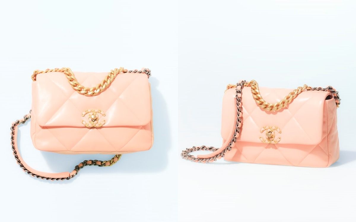 首先登場的CHANEL 19,蓬鬆有份量感的包型搭配柔和的橘粉色調,彷彿自帶濾鏡的光澤感讓人忍不住驚嘆:「也太美了吧!」以雙色金屬交織點綴,增添些微的個性風,也讓淺色系手袋更好駕馭!
