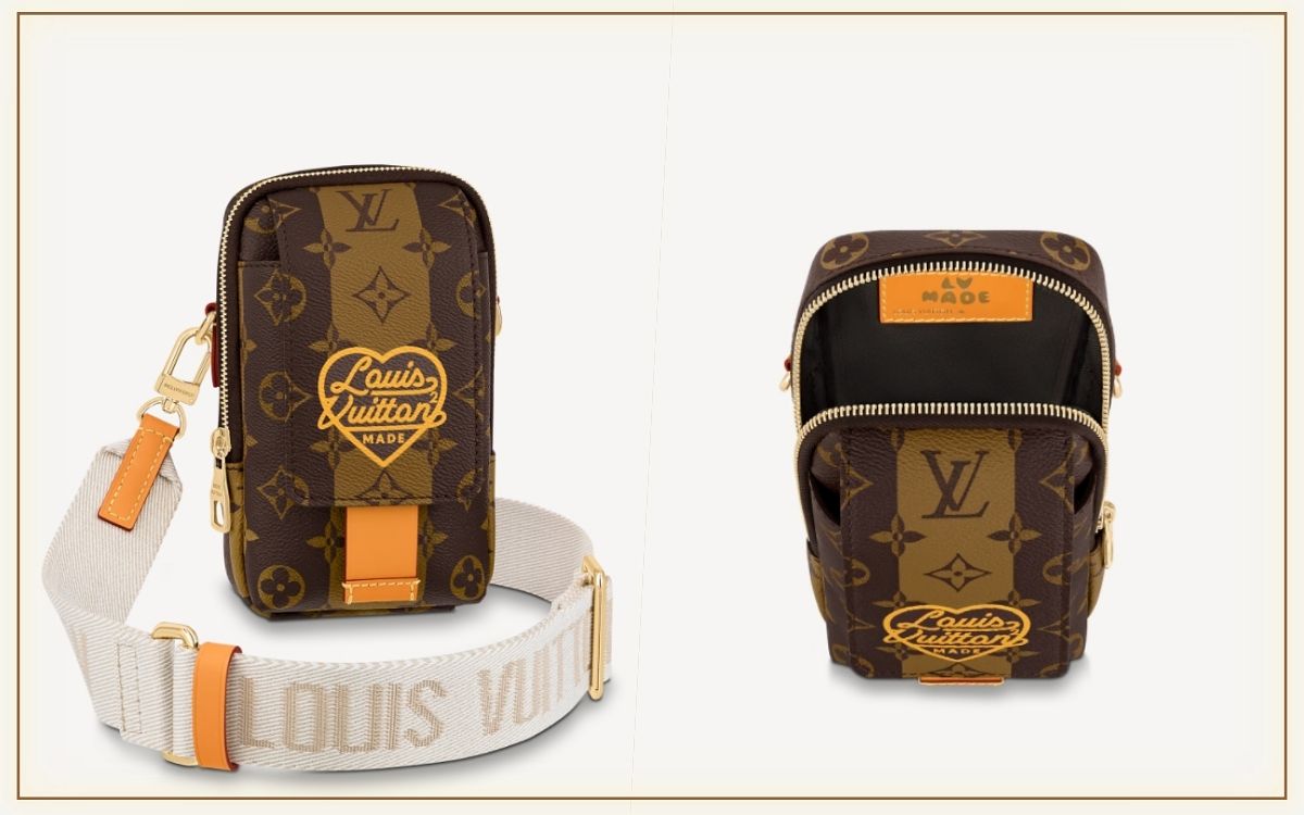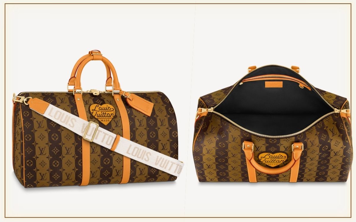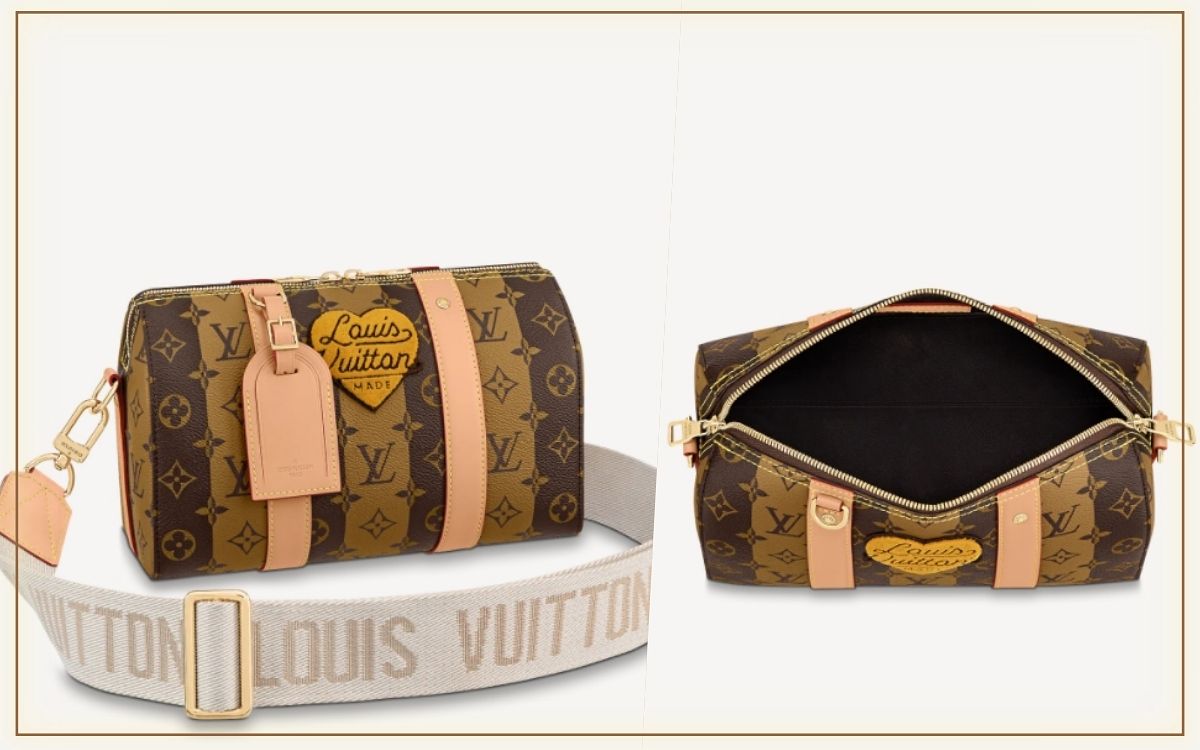 此次聯名系列超限量的設計,包身以全新Monogram Stripes Brown帆布製作,第一眼就吸引目光,暖焦糖棕色與綴有皮革飾邊和復古風Louis Vuitton標誌的心形貼飾,都讓包款呈現別於以往的新穎樣貌,既能肩揹也能手拎、實用性滿分。
