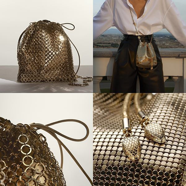 從珠寶經過腕錶領域再到皮件和配飾,璀璨的金色光芒是寶格麗宏大創意宇宙中永不熄滅的光輝。無論是為雞尾酒會的造型增添點睛之筆,還是讓派對造型更加亮眼,新款 Serpenti Heritage Mesh淡金色金屬網格晚宴包都是無與倫比的耀眼單品。這款新包款在復古時尚的手拿包造型中融入珍貴工藝,展現極致奢華與當代氛圍,可謂寶格麗淵遠傳統的嶄新詮釋。軟皮包身採用金屬網狀造型,靈感來自 BVLGARI BVLGARI 珠寶系列的經典圓環主題,傳奇性的雙重鐫刻標誌令人憶起羅馬錢幣上的刻紋。金色鍊帶可斜背亦可肩背,這款令人難以抗拒的手拿包實為佳節時分和歡慶時刻的必備配飾。