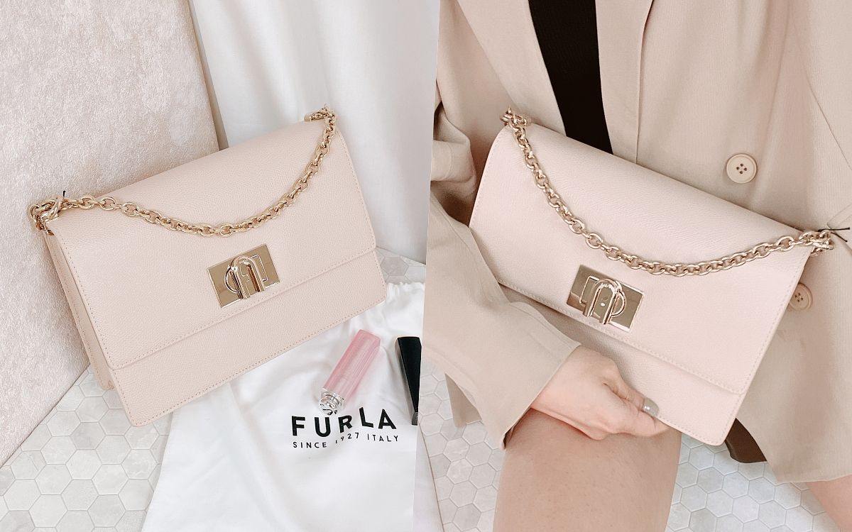 FURLA經典1927系列擁有方正外型與寬敞內部空間,搭配氣質鏈帶設計與淺淺的奶油色系,成為一年四季都萬能百搭的夢幻包款,方便開闔的旋轉扣細節,拿取包包中的物品不再手忙腳亂。