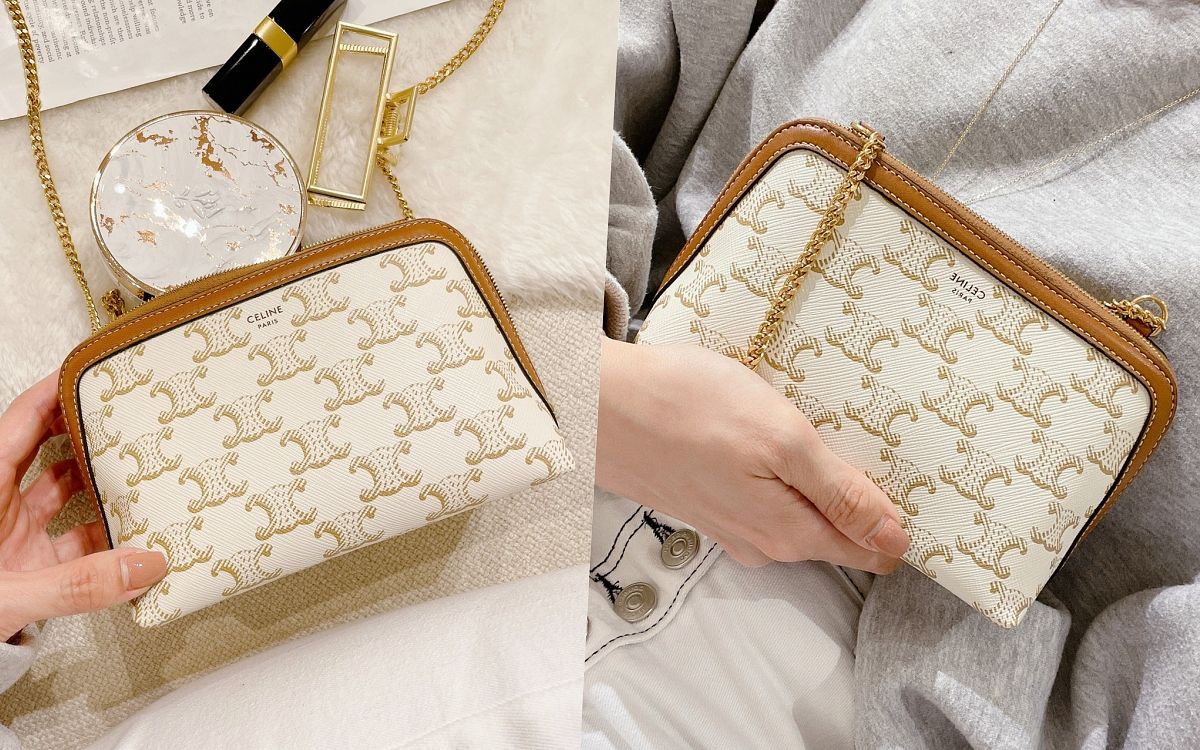 CELINE TRIOMPHE圖騰已經是坐穩新經典寶座的品牌象徵!這顆造型精巧的奶油色調老花包,雖然隸屬於小皮件系列,包款尺寸卻比想像更能裝!金屬肩揹鏈帶更讓包款實用性再加乘,肩揹上身充滿亮點。(資深服裝主編Yoyo)