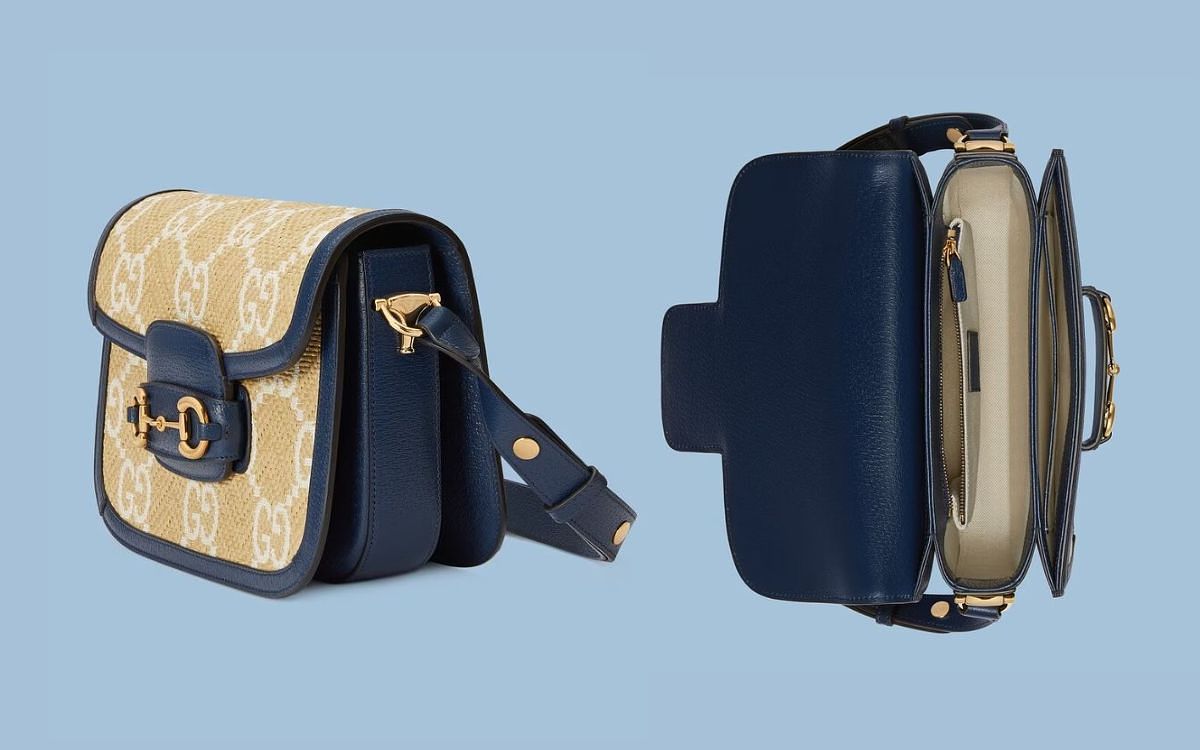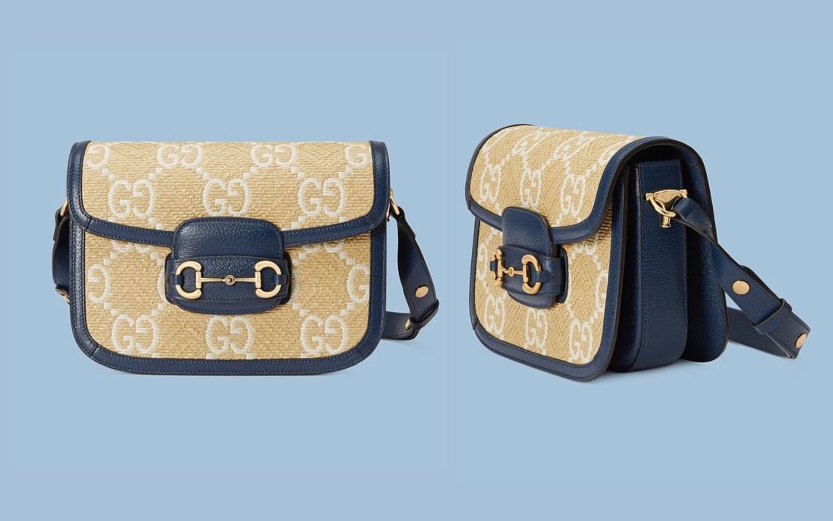 GUCCI官網最新釋出的這款1955馬銜扣方包,採用帶有GG老花圖案的拉菲草效果面料打造,配上普魯士藍的皮革滾邊,真的非常有質感,且異材質的拼接更顯獨特性與精緻感,散發既俏皮又雅緻的豐富層次品味,一年四季都能背它、超級百搭不NG!