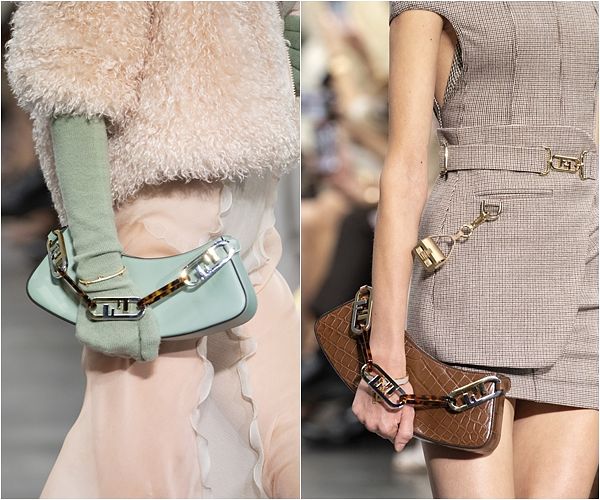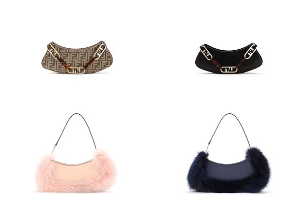 採用 1990 年代簡約時尚風格廓型的 FENDI O'Lock Swing 包款,正好是 FENDI 和當下潮流所追求的腋下包風格。包身上飾有經典 FENDI Roma 金色金屬字樣,散發出青春洋溢又不退流行的魅力,可以輕鬆夾在腋下,邁開步伐自在前行;又能當成時尚的手拿包,極為實用的拉鍊讓您不怕包中的物品掉出。有本季從黑色到鴿灰色和米色的光面皮革,或是 FENDI 招牌的 FF logo 圖案織錦布料可供選擇,這些款式均附有可拆式皮革肩帶,又能將 O'Lock 鍊條裝飾在包身或手上。另有奢華感十足的鱷魚皮或千鳥格紋布料款式,配以具有 O'Lock 金屬細節的皮革肩帶。千鳥格布料款式還加入珍貴的狐狸毛皮草,特殊的蟒蛇皮款式同樣飾有狐狸毛皮草,配有成套帶有 O'Lock 金屬細節的肩帶。