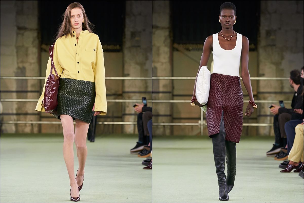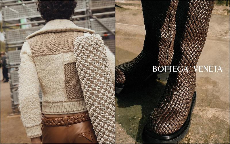 嶄新的 Kalimero 及 Rumple 包款,以極具澎度且特殊抓皺處理的皮革編織而成,放大的編織紋路與柔軟厚實的觸感,展現溫潤的工藝外,更添療癒雅致的氛圍。而最為經典的小編織,除了運用於裝飾著流線結構的黃銅手柄的Sardine 包款上,彷彿藝術品般亮眼,更躍上鞋履及服飾配件,不論是女士高跟靴,男士皮鞋,或是時髦的低腰短裙,恰如其分的在各式輪廓之中獨具一格。Bottega Veneta 的標誌,在 2022 秋冬刻劃無限的可能,流動的極致工藝,回歸根源超越風格。