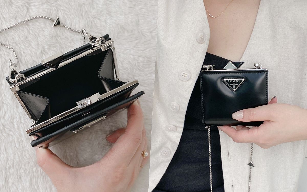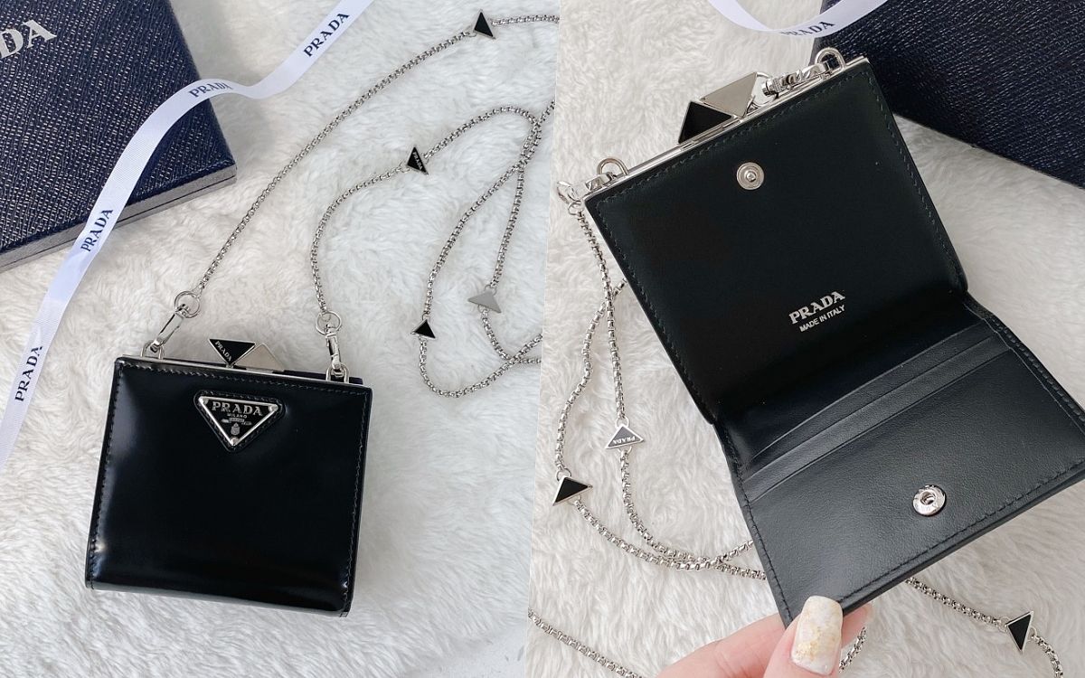 此款極具潮流感及俐落個性的鏈帶短錢包WOC,將Prada最經典的三角形LOGO標誌演繹成奢華且現代的搪瓷特色設計,點綴零錢夾層的搭扣和鏈條肩帶,呈現滿滿的細節品味,錢夾配以品牌經典面料的拋光皮革縫製,低調微光澤的黑色皮革與銀色五金、幾何造型完美結合,兩側皆有搭扣可開合並有多個卡槽,實用性與搭配性兼具,令人無法抗拒。