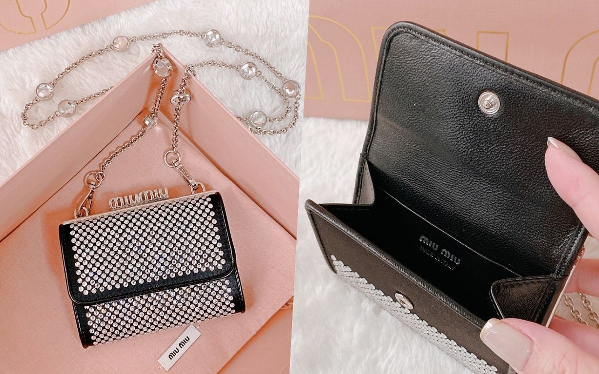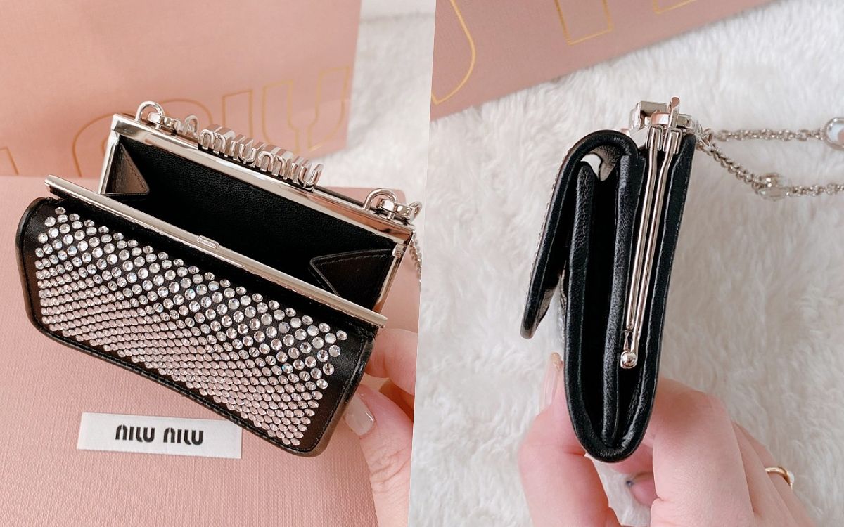以品牌標誌性的珍貴納帕軟皮縫製,搭配閃亮精緻的人造水晶綴飾於包款表面,體現出Miu Miu獨特的高貴優雅風尚,同時散發低調華麗的女人性感品味,主要兩個口袋可分類收納鈔票零錢與卡片,其中搭扣零錢袋更以miu miu LOGO裝飾更添特色,另外配有一條可拆除式鑲嵌水晶的金屬肩帶,實際揹上身超級加分整體造型!