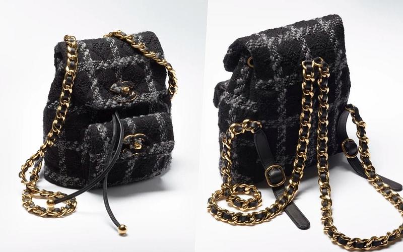 後背包輪廓搭配香奈兒獨具識別的皮革金屬鍊帶,羊毛斜紋軟呢化身成為包身主要材質,經典又歷久彌新。