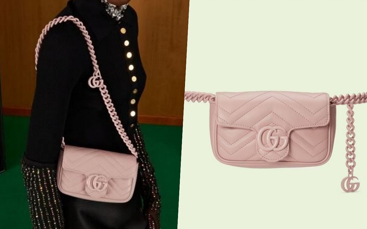 眾所周知的GG Marmont以仿舊金屬的雙G LOGO,及V字形絎縫皮革搭配粗鍊帶為主要印象,呈現既俐落有型又帶著華麗古典感的低奢氛圍,而此次新款GG Marmont鍊帶腰包將仿舊五金配件的部分替換成淺粉色的硬件,整體以陶瓷效果飾面打造極具現代感及潮流趣味的包款,在LOGO及鍊帶上變換了新裝,為原本略帶成熟及奢華的包款,注入青春活潑的元素,同時採用粉紅色 V 字形絎縫皮革搭配更顯夢幻仙氣。