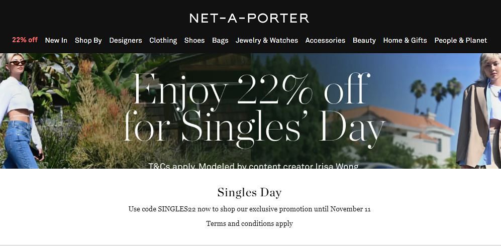 超人氣的英國知名精品網站NET-A-PORTER今年雙11優惠,大幅超前部屬開跑!從10月21日即可享早鳥優惠,進入雙11指定優惠頁面,眾多精選原價新品輸入折扣碼【EARLY22】可立即享78折優惠。另11月4日至11月11日開跑正是雙11優惠。