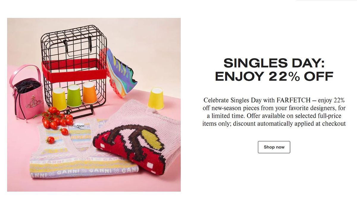 凡雙11單身節活動期間,至FARFETCH網站指定折扣精選頁面消費滿NT$5,000即可立即享78折優惠,結帳訂單滿額將自動折扣,無須額外輸入折扣碼,另寄台灣國際運費NT$500,滿一萬則享免運。