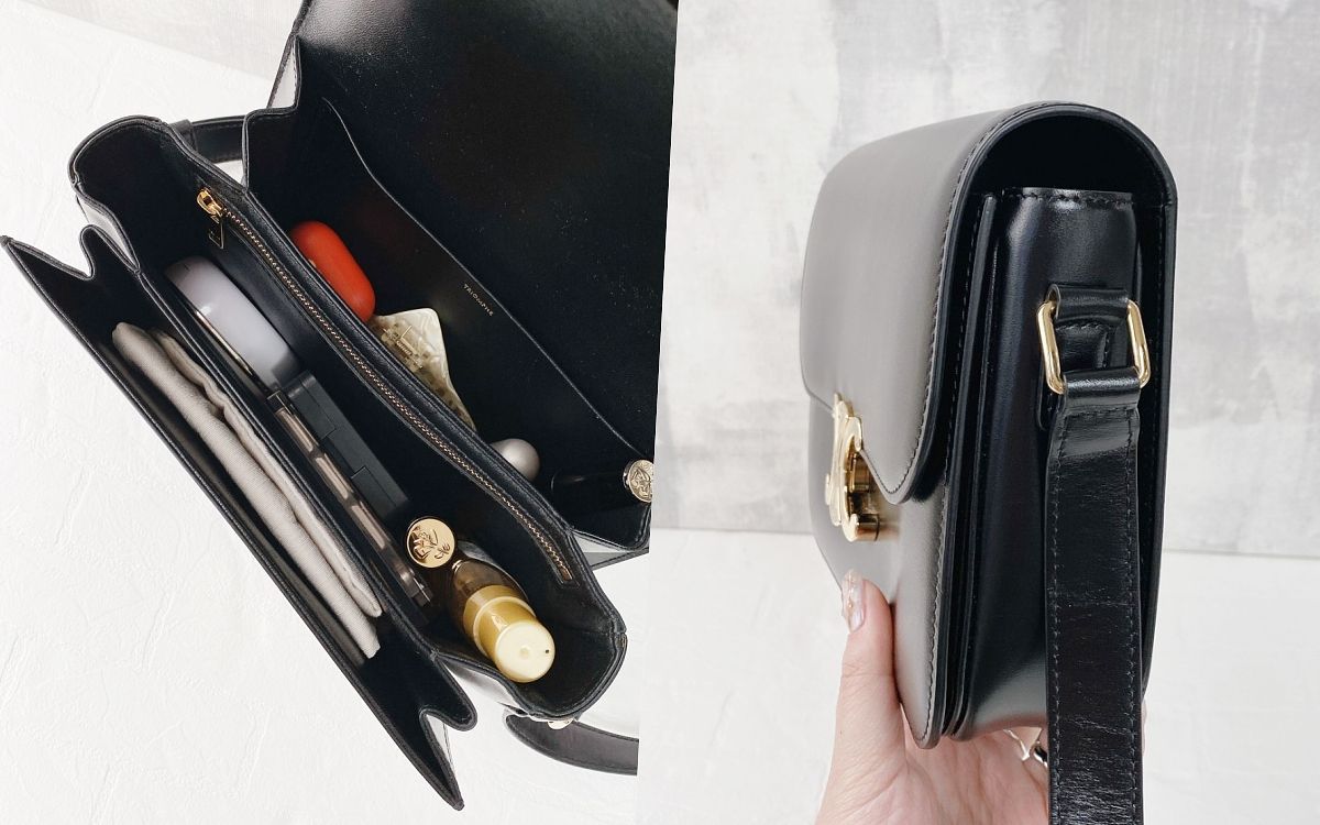 CELINE TRIOMPHE可說是品牌於現今最受歡迎、再創經典傳奇的設計,以凱旋門LOGO煥發現代優雅與摩登復古的嶄新韻味,包包整體以光滑小牛皮材質打造,細緻工藝技術襯托出簡約俐落的魅力,迷人的細膩亮面光澤感既高級又雅緻,包包內部空間有多個格層,可放入手機、短夾、耳機、彩妝等日常必備物品,且包身能完美撐開使用,包蓋不會有蓋不上或包身變形的問題,令人愛不釋手!