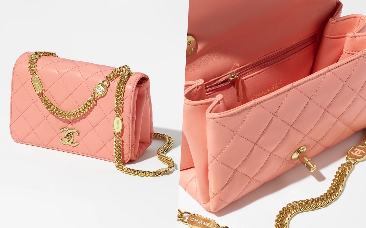 CHANEL最經典的口蓋包款以迷你包型,將時尚潮流融入且將預算下修,讓許願的女生們更有機會入手,此款小羊皮的溫潤細膩質感將蜜桃粉色襯托得更加柔美,與琺瑯、金屬搭配出既可愛又華麗的風格。