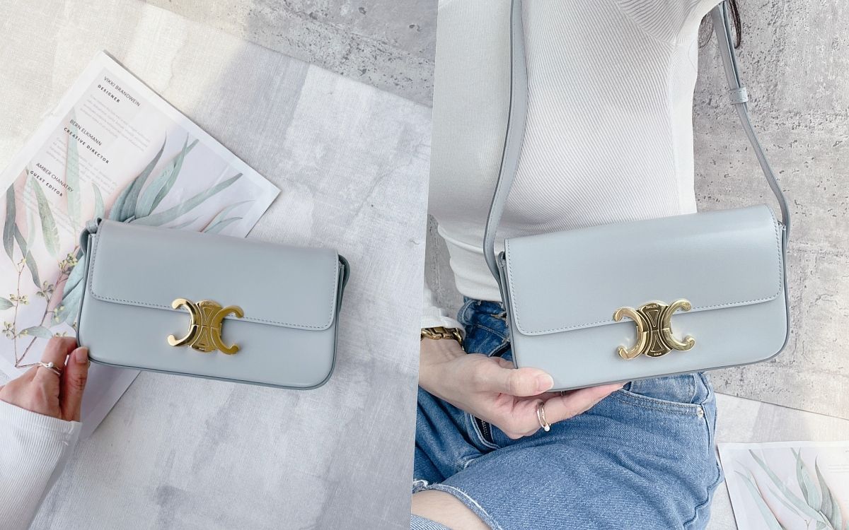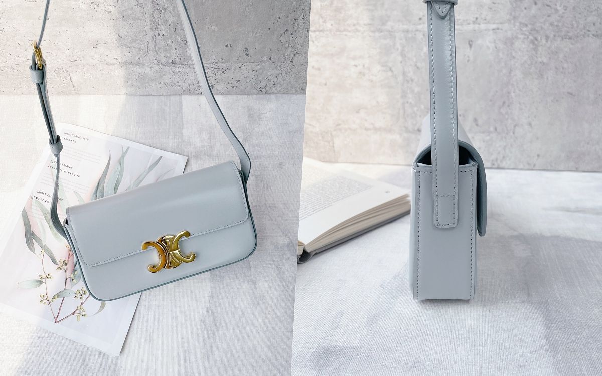 令人著迷不已的CELINE TRIOMPHE凱旋門包款,以極具識別標誌入主女子們心中最該擁有的精品包寶座!精緻小牛皮材質手感溫潤細緻、可以調節的肩揹帶能夠因應不同的身高需求,洗鍊外型輪廓搭配柔嫩春季新色、一揹上就展現個人獨樹一幟品味。