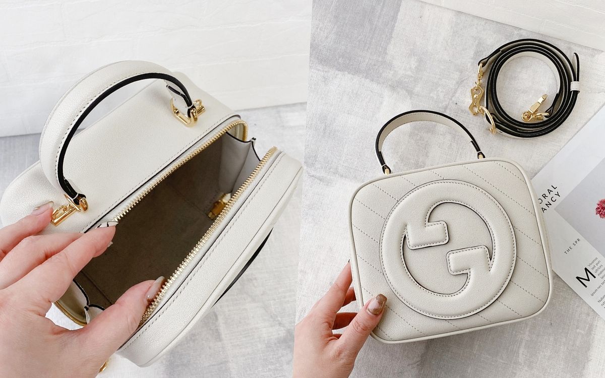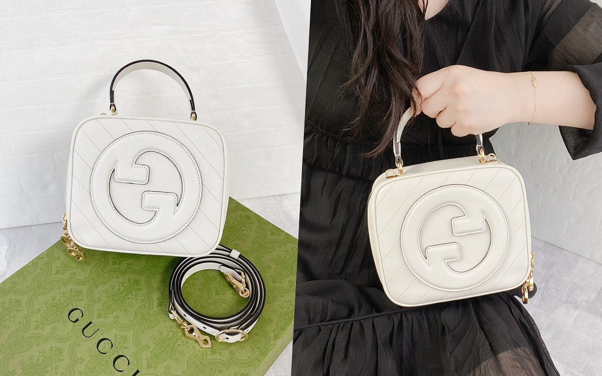 源自Gucci典藏設計的圓型互扣式雙G標誌在方形小盒子包款上形成有趣的對比,這款匠心演繹的Gucci Blondie系列新款手提肩背包擁有細節滿滿的設計,別開生面的立體方形輪廓搭配手提短把十分復古且精緻,另還配有一條長背帶讓實用性大大提升。