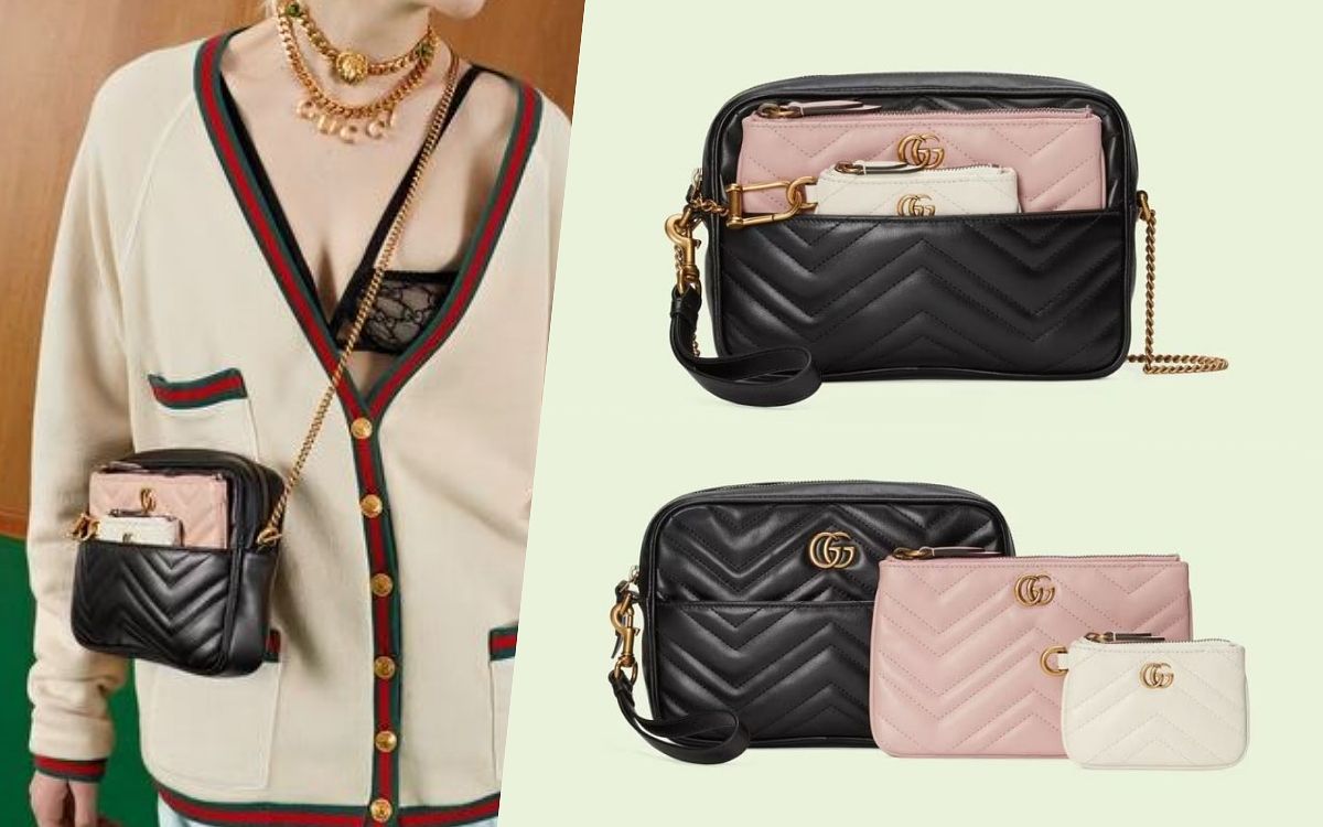 Gucci這款多用途迷你手袋以經典復古的V形絎縫皮革為主角,將黑色與粉色、米白做完美的搭配融合,且包款的呈現設計顛覆想像,粉色與白色的拉鍊袋看似獨立卻又能無違和成為包包的配飾,締造別開生面的獨特造型,也為包款的實用功能大升級,且三款手袋更能分開使用,CP真的超級高!