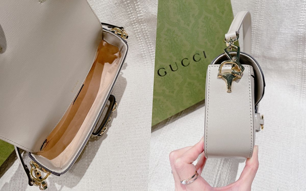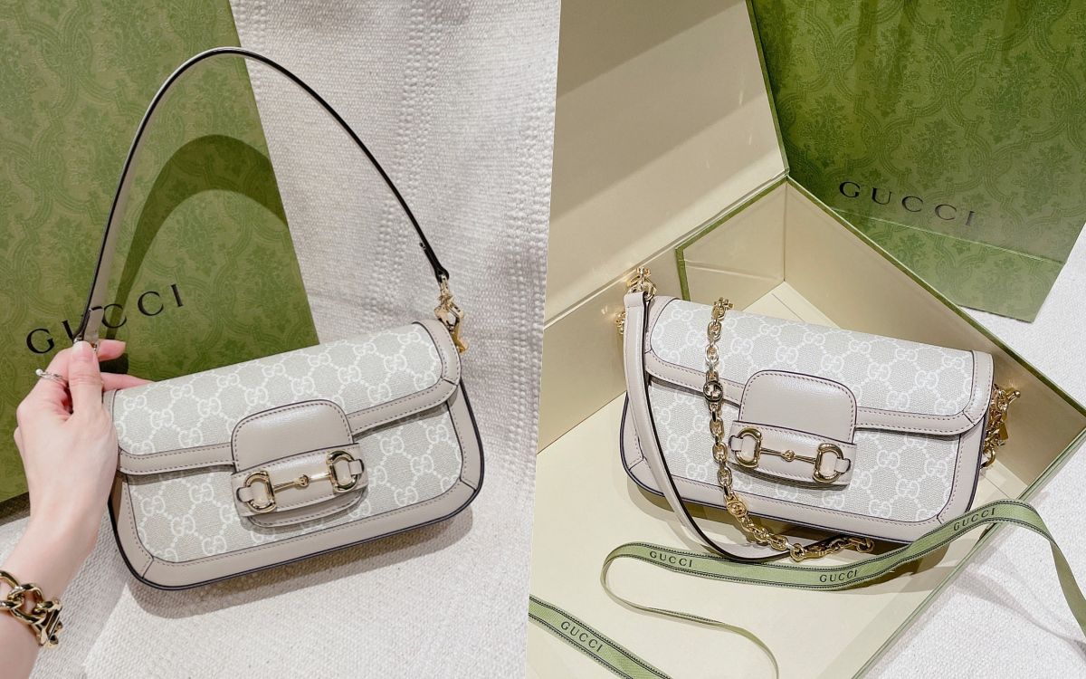 這款HORSEBIT 1955奶茶色老花包一映入眼簾就令人心動不已!經典包型以優雅洗鍊的扁長輪廓設計,更為率性洗鍊又兼具都會質感,同時依然優雅溫潤。包款正面中央飾以金屬馬銜鍊裝飾,帶出品牌的馬術淵源歷史,兩款可調整長度的皮革肩帶和金屬鏈帶,更讓攜帶方式時髦又多元。