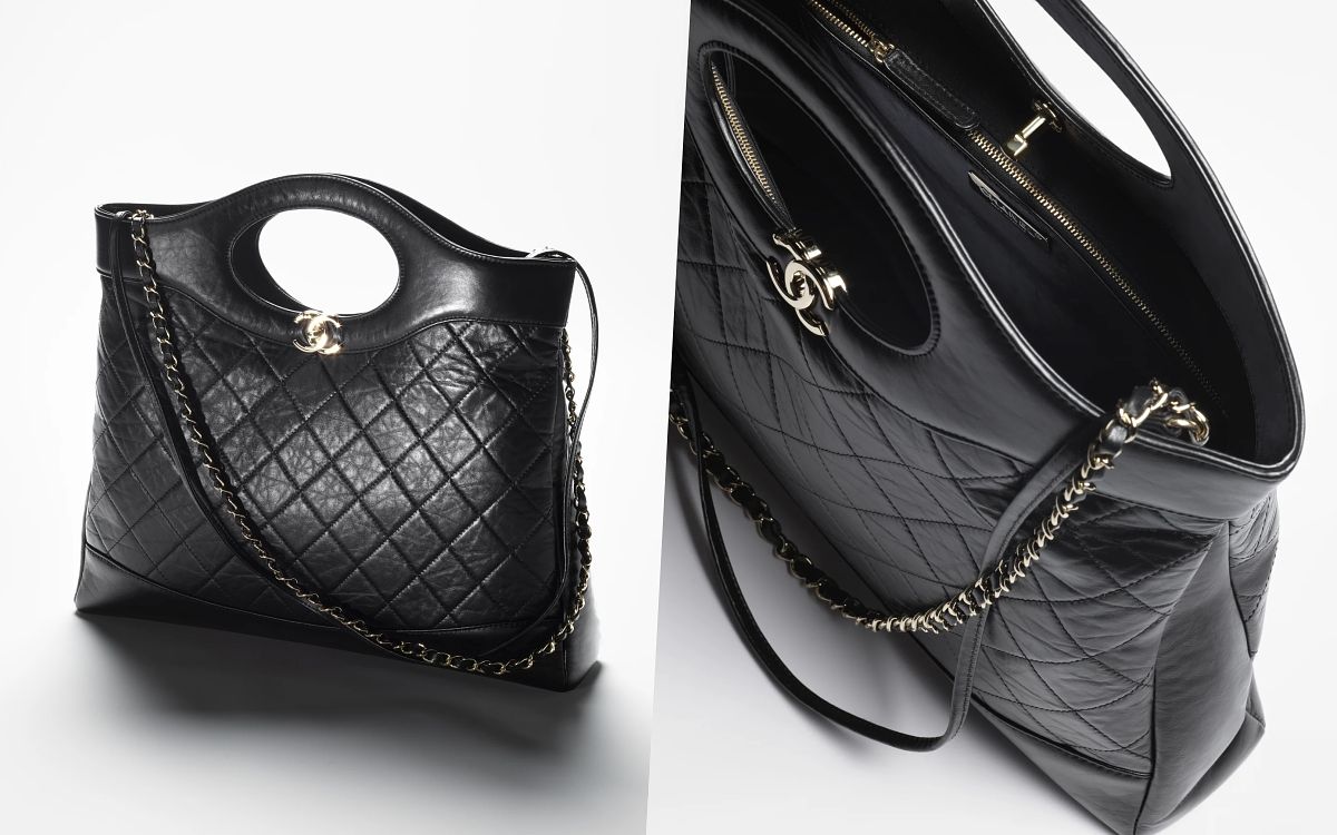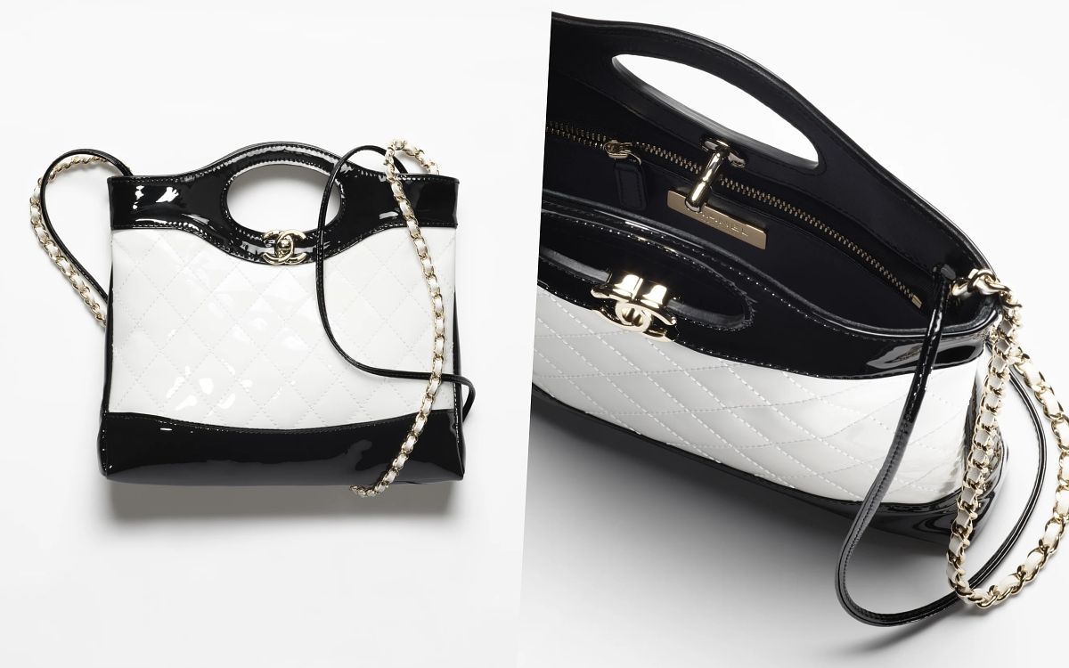 香奈兒過去已停產的經典包款31 Bag在本季強勢回歸,瞬間登上時尚圈最熱門的話題包款,延續了Chanel 22購物包的寬敞容量與大包尺寸,獨特的中空提把設計、立體硬挺的包型輪廓呈現出和22 Bag截然不同的法式優雅且幹練成熟的氛圍,共有兩個尺寸,大型款隨性俐落,迷你款則以漆皮創造精巧俏麗的造型,且拼色設計更顯別緻出眾,兩款都配有經典皮穿鏈長背帶,絕對是本季小香最該收藏、高保值的包款!