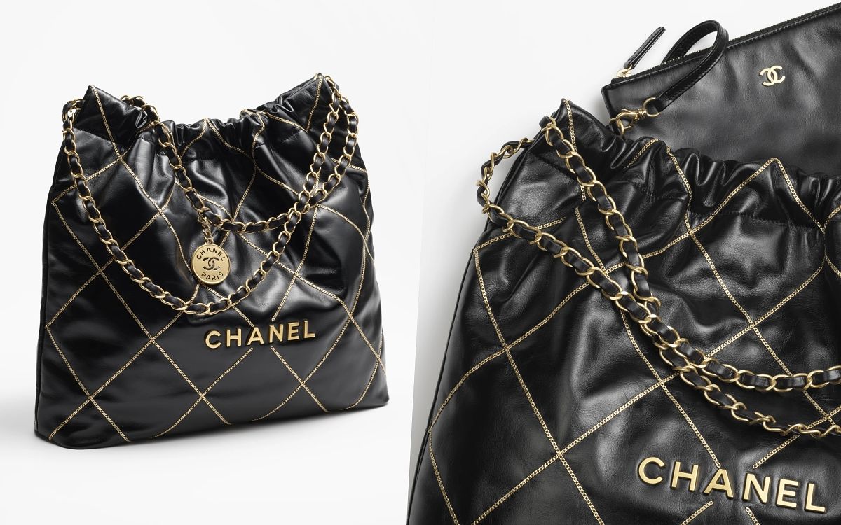 這次除了CHANEL 22 MINI新色上架,CHANEL 22中款尺寸也推出了一款以小香最經典黑金配色為主的新款式,在標誌性菱格紋上以精巧細膩的金鍊紋路為格紋,點綴在柔嫩光澤小皮皮上,遠看似金屬繡線般的精緻,和經典皮穿鏈帶、CHANEL金屬標誌和吊牌相印襯,實在既優雅雋永又別出心裁,絕對是下一波香奈兒的爆款搶手手袋!