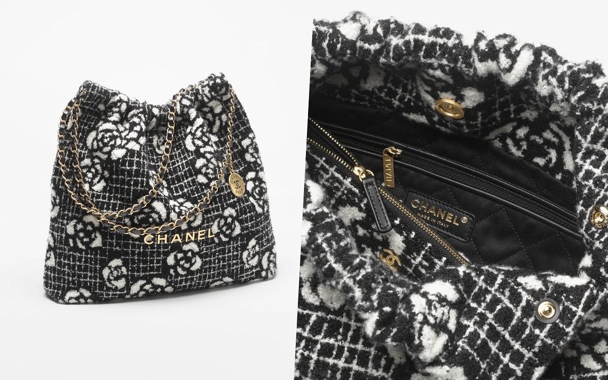 而一般尺寸的Chanel 22包比起Mini款其實大了不少,但是對於一般女生來說也不會過大,比較像是托特包的大小,基本款亮面小牛皮簡約又實用日常,而2023/24秋冬新款以山茶花與黑白毛呢面料打造出華麗奢華的優雅氛圍。