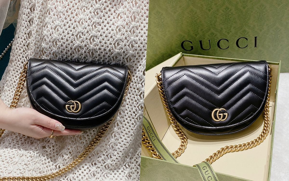 Gucci最新季度登場的GG Marmont 鏈條迷你半月包,在經典袋款中注入大膽新意,半月包型的輪廓架構展現品牌永不設限的態度與潮流設計,Marmont系列最代表形性的V型絎縫皮革,擁有低調奢華的澎潤光澤與細膩手感,搭配雙G復古金屬飾件與粗鏈條,在現代風格中保有傳統精隨,既雋永典雅又充滿俏皮活潑的流行氛圍。