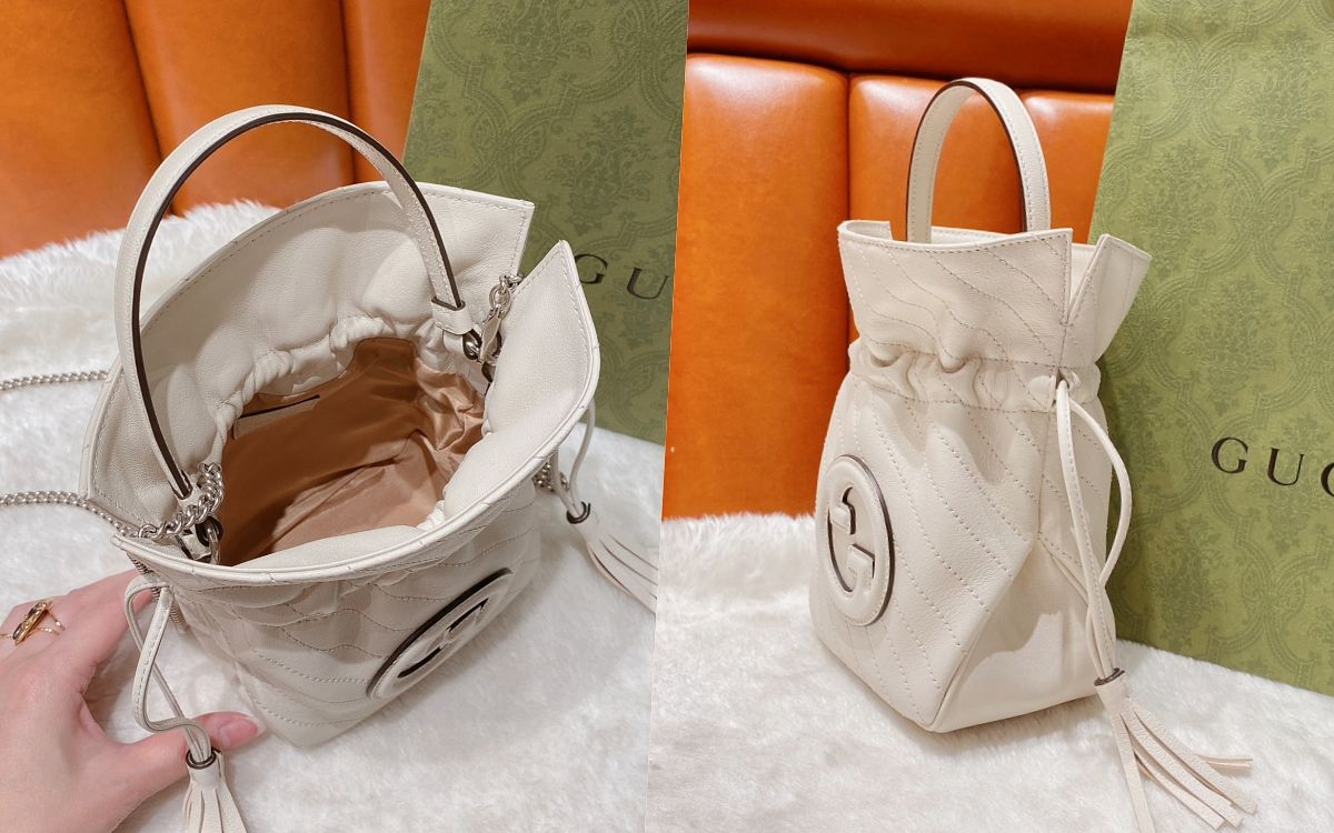 GUCCI BLONDIE系列最新登場的這款包款以圓形幾何版本、同色系皮革的互扣GG設計為基礎,展現品牌俐落時尚的當代設計美學,包款整體外觀更有著斜紋縫線增添豐富層次,而這款水桶包最特別之處在於抽繩束口與流蘇綁帶細節,搭配銀色細金屬鏈帶展現甜美個性的氛圍,同時附有提把可變換揹用方式與搭配風格。