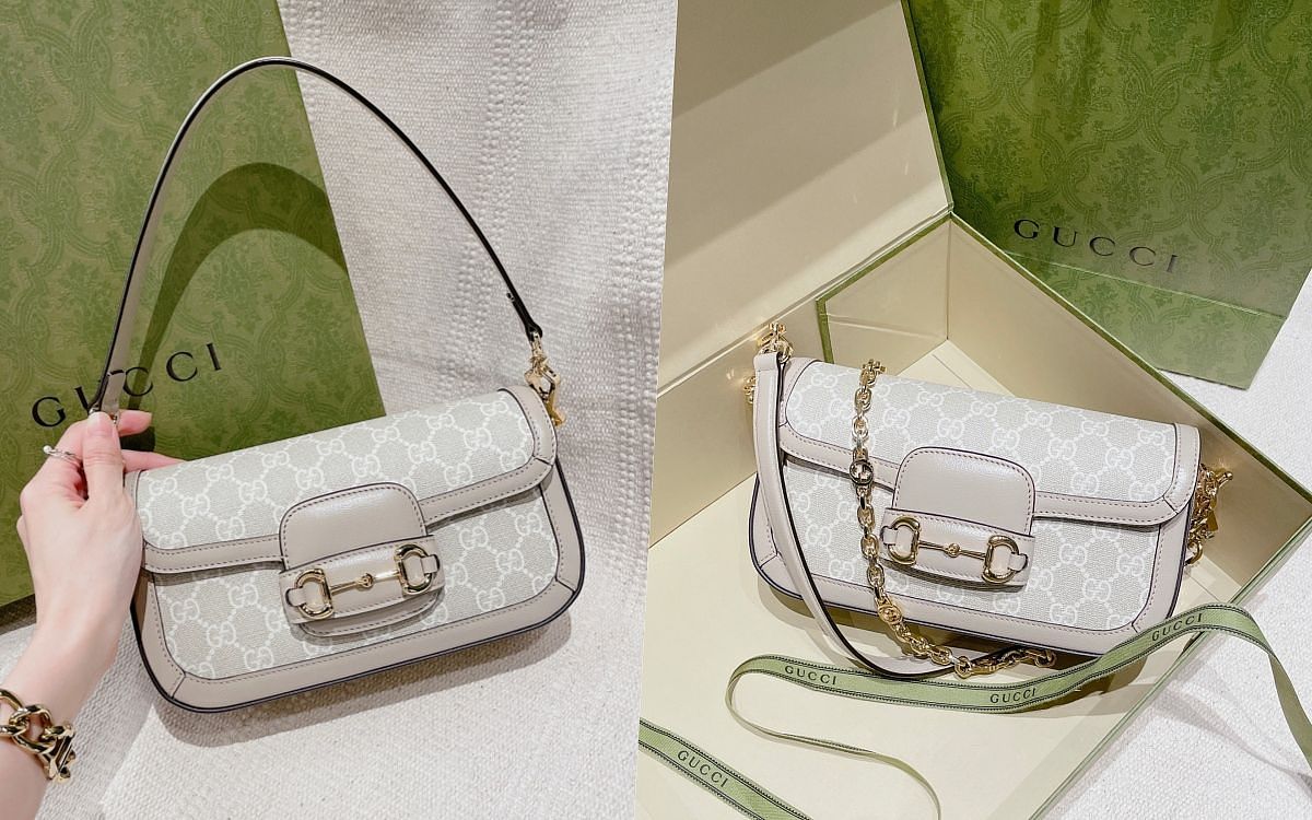 Gucci最具代表性的經典包款之一Horsebit 1955馬銜扣包,品牌以優雅洗鍊的扁長型輪廓搭配腋下包款式來重新演繹,讓原本休閒率性的包款瞬間轉變為溫柔高雅的日常配件,且奶茶灰色調的老花及皮革拼接更使整體散發復古雅致的氣息,兩款可調整長度的皮革肩帶和金屬鏈帶,也讓攜帶方式時髦又多元。