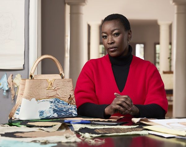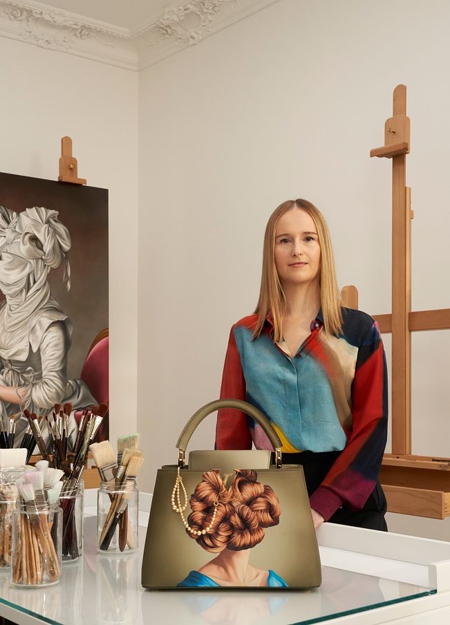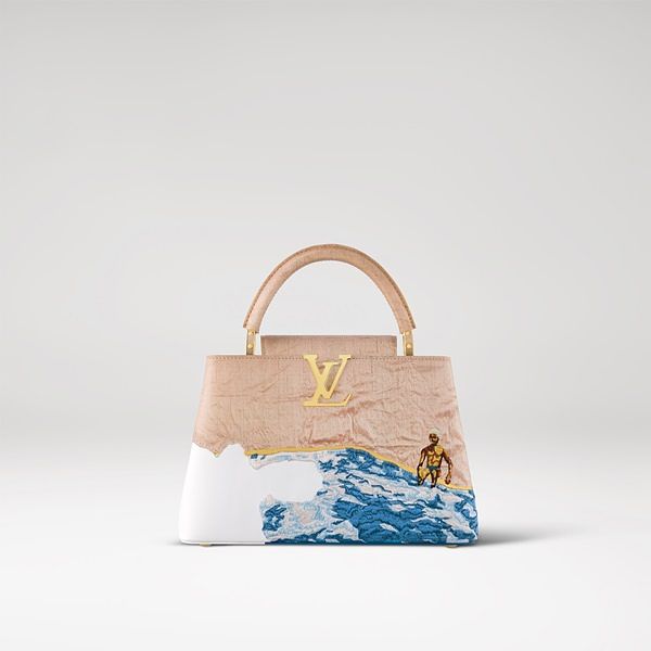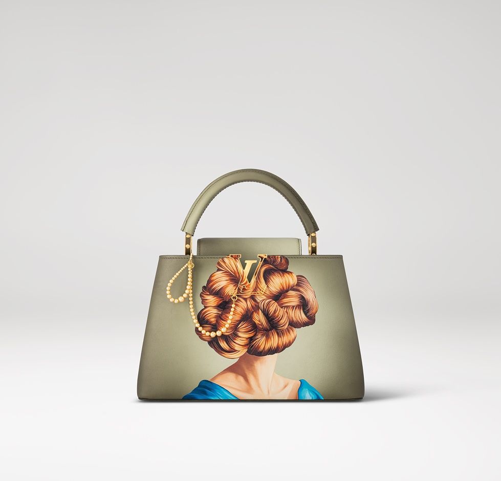 出生於馬拉威、現居南非的Billie Zangewa,刻意用殘缺、不完整的生絲來拼湊出風景和人物肖像,她運用極為清晰的錯視印刷、高度表現張力的刺繡,以及有意讓人看見手工縫合痕跡等製作工藝,將自己在 2020 年以兒子 Mika 為主角所創作的《The Swimming Lesson》作品重現在 Artycapucines 系列的 Capucines 包款上。波蘭畫家Ewa Juszkiewicz長期以來對女性身分及其在西方典籍中被壓抑的角色興趣盎然,她選擇使用極為清晰的版畫印刷技術,將其 2021 年所創作的超現實主義作品《Ginger Locks》印在 Capucines 包上,並且用一串金色珍珠加以襯托。在像是 1995 年創作的《Kitchen》等大型雕塑品,以及更能表現個人內心深處想法的藝術品上使用珠子,或許是美國藝術家Liza Lou最廣為人知的創作手法。麗莎.露在她所創作的 Artycapucines 系列中,將這種細小又精美的珠飾壓印在柔軟的皮革上,再運用柔和色調精緻地印出,以如同雕塑一般的第二層皮膚覆蓋在 Capucines 包身上。法國籍塞爾維亞裔藝術創作雙人組合Tursic & Mille在創作 Capucines 系列之際,運用其對當代社會影像超載和語境重構的興趣,將 Capucines 包款重新塑造成招牌的花朵形狀,並且運用五顏六色的刺繡將 2021 年的畫作《Tenderness》搬到 Capucines 包身上,搭配燒焦的雪松木手柄和鑲嵌的 LV 標誌。中國藝術家王子平所創作的迷你 Artycapucines 系列 Capucines 包款,是在該系列迄今尺寸最小的一個。完美結合皮革拼接和鑲嵌工藝,有著鮮豔明亮的色彩及甜美可愛的圖案,對我們這個視覺飽和、自我反思的世界賦予了有力的詮釋。