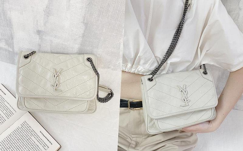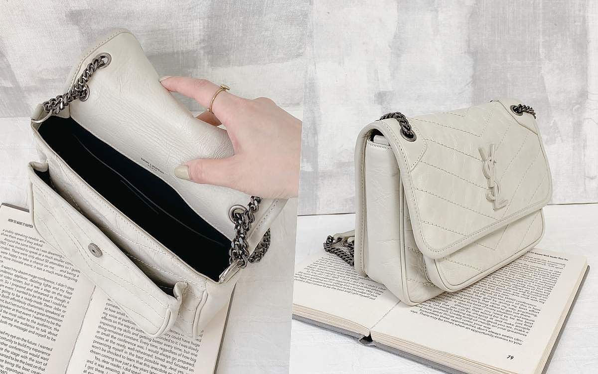 YSL最不可忽略的經典包款絕對是NIKI包!它可說是品牌的傳奇代表,這顆NIKI包以復古奶白色的小牛皮打造成翻蓋手袋,配以V紋縫線、飾以皮革包邊CASSANDRE,整體包身輕盈好揹,內部有兩個隔層,背面有一個大型貼袋,加上滑動式鏈條肩帶,方便肩背或斜背。
