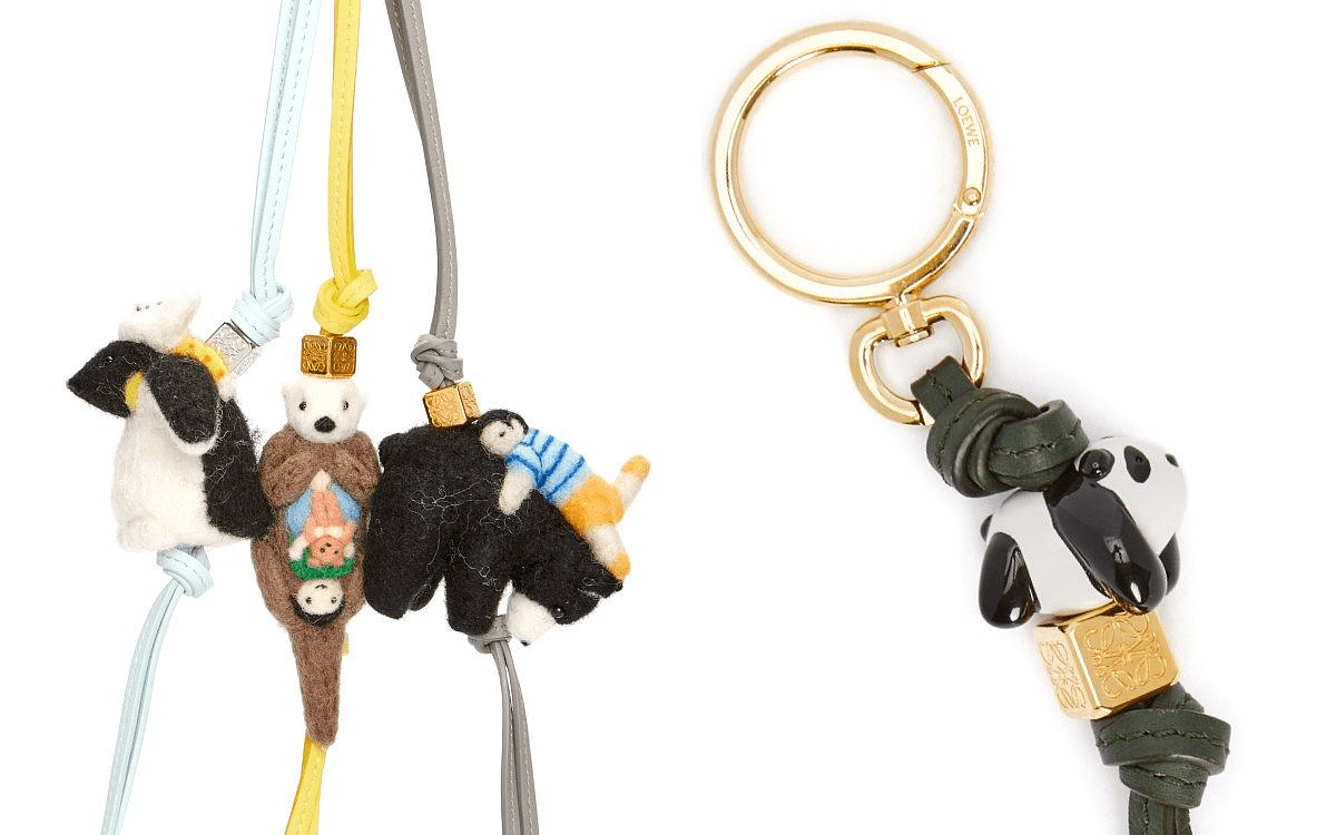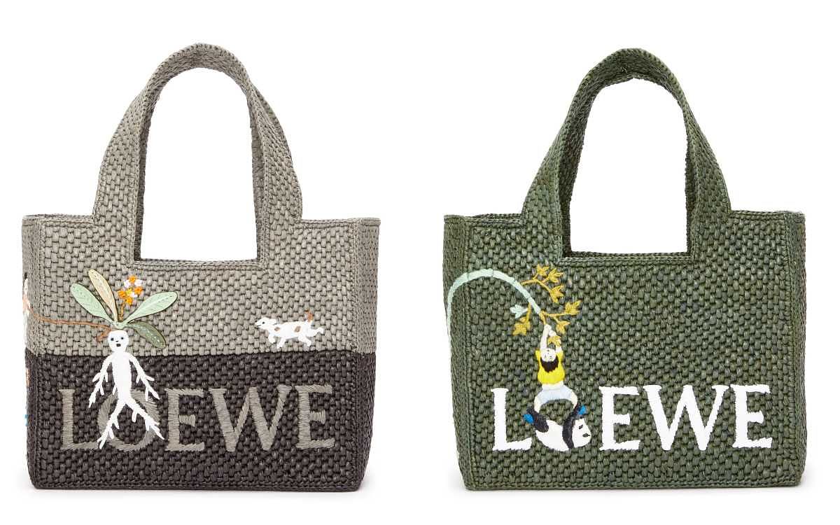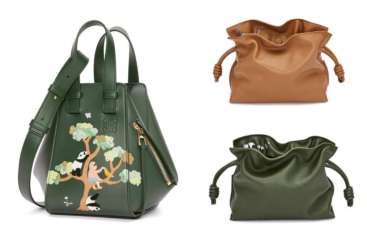 他們筆下的角色躍上 2024 早春系列的針織服、牛仔服、經典包款、拖鞋、錢包及配飾:墨綠色Hammock 包款可見樹頂枝葉化成雲朵狀,小男孩坐在樹上餵著一隻黃色小鳥,同時有隻熊貓爬到樹枝上,另一頭熊貓已滑到樹下,場面帶點趣味感;曼德拉草及水獺幻化成柔軟绒布玩具,躍上圓點皮卡套,而 Hammock 包款的背帶掛著一頭淘氣狐猴及毛氈海豹掛飾。