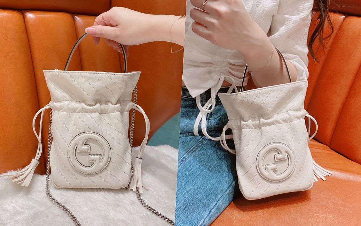 GUCCI BLONDIE系列最新登場的這款包款以圓形幾何版本、同色系皮革的互扣GG設計為基礎,展現品牌俐落時尚的當代設計美學,包款整體外觀更有著斜紋縫線增添豐富層次,而這款水桶包最特別之處在於抽繩束口與流蘇綁帶細節,搭配銀色細金屬鏈帶展現甜美個性的氛圍,同時附有提把可變換揹用方式與搭配風格。