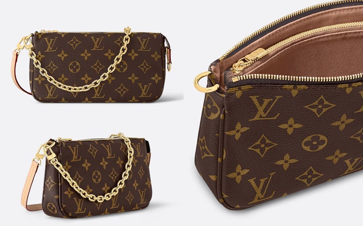這款Pochette Accessoires是LV傳奇經典的手袋款式之一,以代表性的Monogram老花帆布製造,最適合收納日常必需品。整體設計簡約時尚別緻,備有可拆式的天然皮革肩帶及金色鏈帶,可搭配不同造型並提供多種攜帶方式,隨身包採用安全穩妥的拉鏈設計,打開展現寬敞的間隔,且設有多個拉鏈口袋及貼袋及兩個名片夾層非常實用。