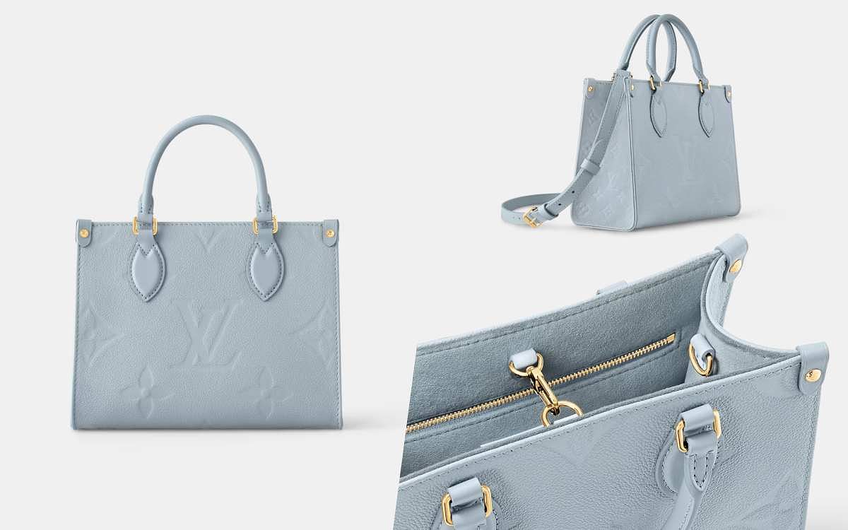 LV這款實用滿分的OnTheGo PM手袋本季以色調清新的霧藍色搭配粒面Monogram Empreinte皮革打造,並飾以Giant Monogram壓花圖案彰顯低調魅力,尺寸上是經典OnTheGo的小巧版本,更加適合日常各種場合揹用,並配備頂端手柄及可調節長度的可拆式肩帶,提供多種方式攜帶和搭配,不得不說這個優雅的藍色和金色五金配起來太高級了!