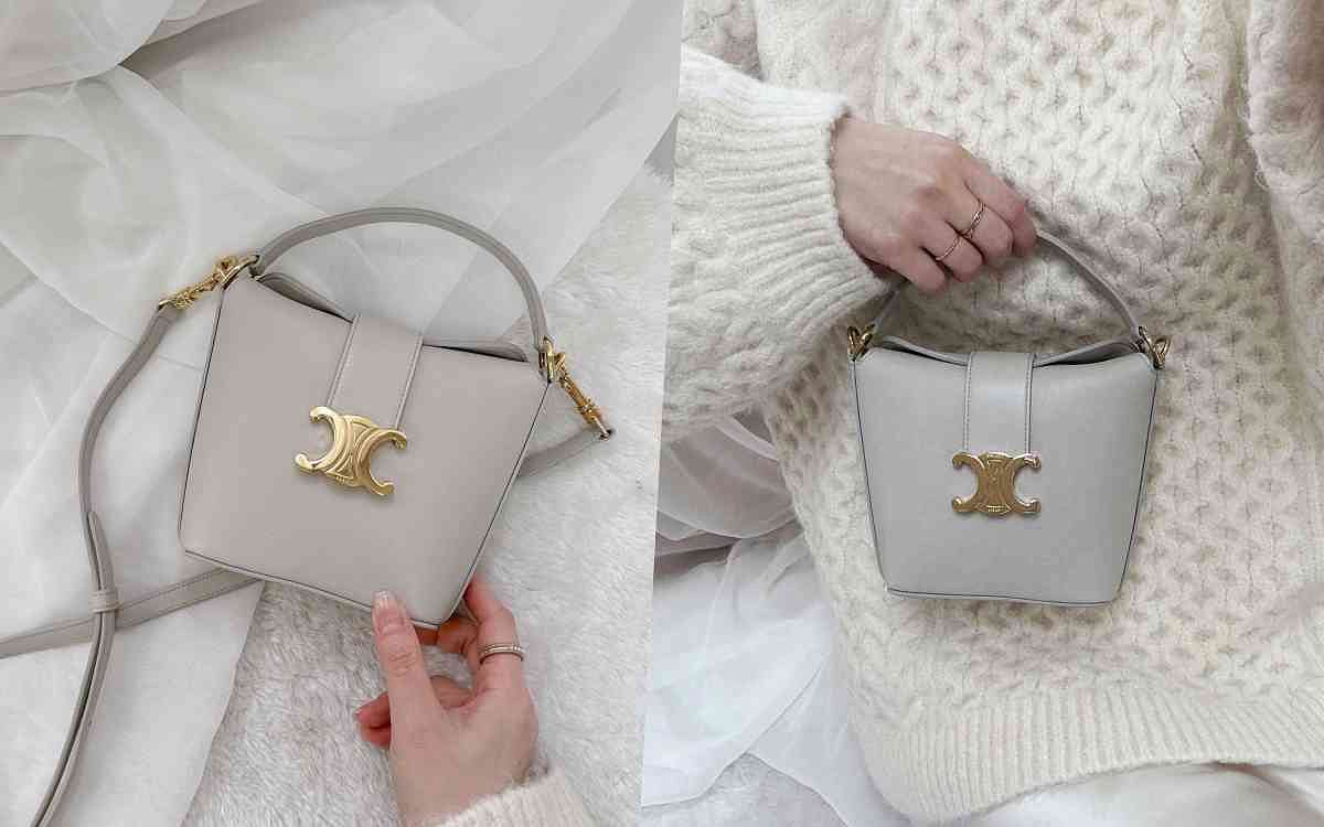 這顆淺石灰色的水桶包真的超美又可愛,是CELINE 2024最新季登場的手袋款式,被網友們暱稱為「薯條包」,因為整顆包款的包型輪廓就像薯條盒一樣,搭配上飾有金屬飾面凱旋門標誌的皮革寬帶設計,真的超簡約時尚、太想擁有!配有短手提把和可調節、拆卸的長背帶,日常使用變化性高又方便輕巧!