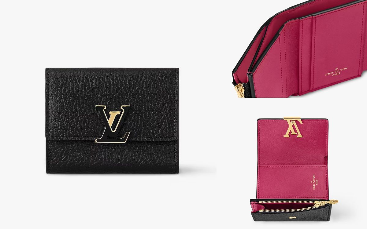 這款Capucines XS錢包可放於各款Capucines手袋,即使小型的BB款式也可輕易收納,皮夾以全粒面Taurillon皮革製造,配以滑面小牛皮襯裡,雙色配色的巧思充滿驚喜,而按扣開合還飾有經典的皮革飾面LV標誌。